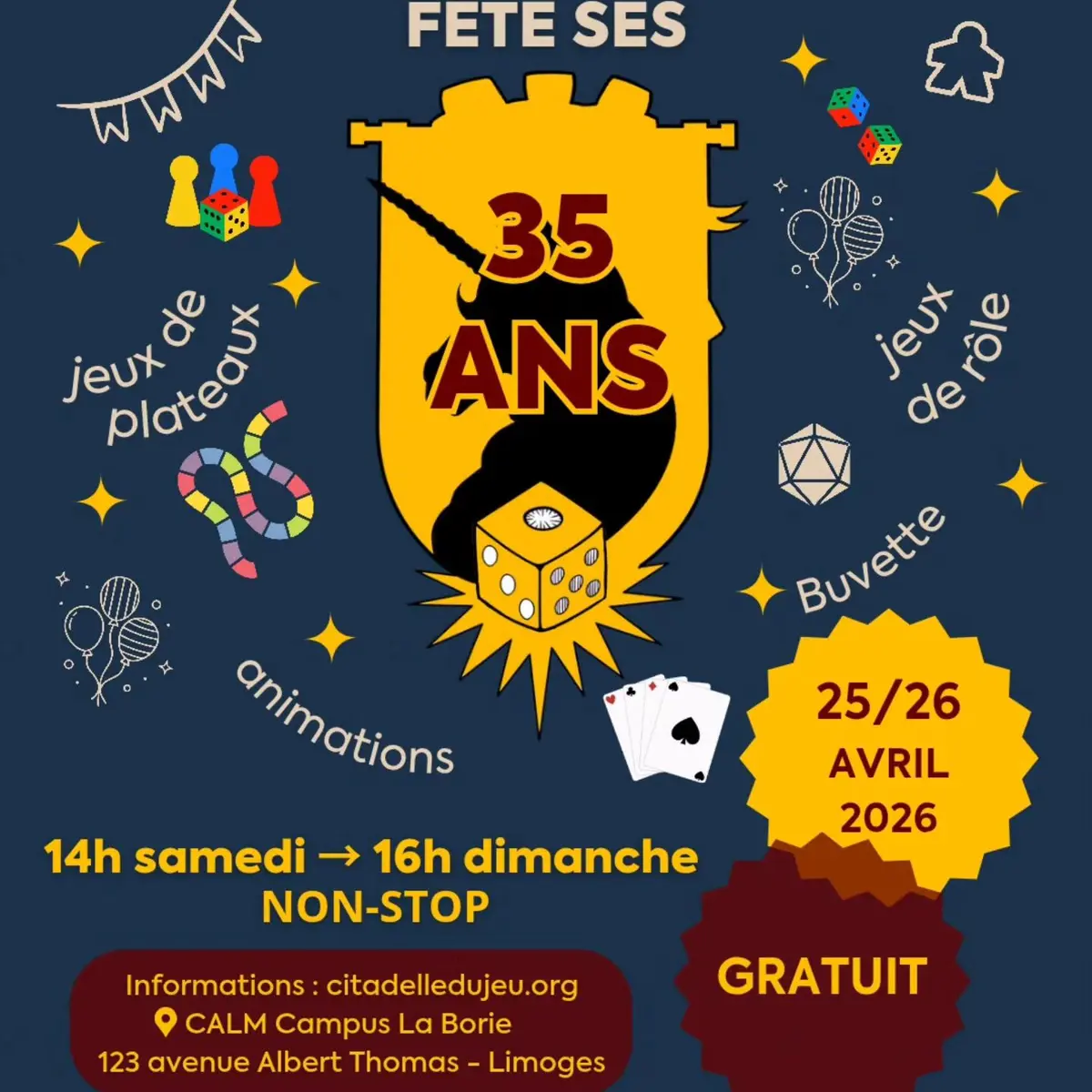 Depuis 1991, La Citadelle du Jeu, c’est avant tout une grande famille de joueurs. Pour souffler leurs 35 bougies, l'association vous invite à vivre un moment unique avec des jeux de plateaux, des jeux de cartes, des jeux de rôles, des quizzs, des tournois, etc... pendant 24h Non Stop. Pas besoin d’être un expert, l’important c’est de participer et de passer un bon moment ensemble. Amenez vos amis, famille, votre bonne humeur ! Qui est prêt à tenir jusqu’au bout ?