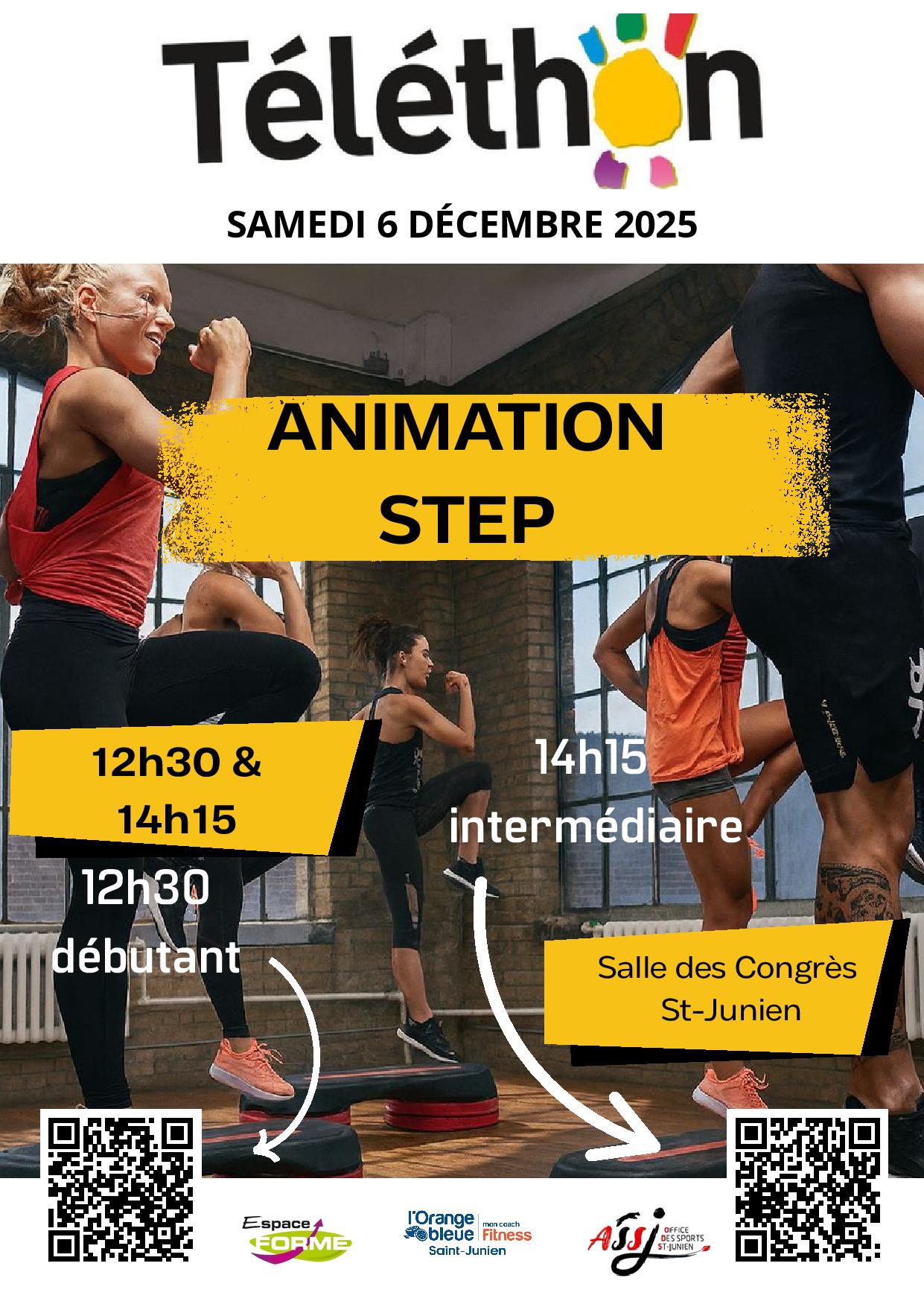 Rejoignez l’animation Step organisée à l’occasion du Téléthon, à la Salle des Congrès de Saint-Junien ! Dans une ambiance dynamique et motivante, profitez de deux créneaux adaptés à tous : à 12h30, une séance spéciale débutants pour découvrir le step en douceur, puis à 14h15, un cours intermédiaire pour celles et ceux qui veulent se dépasser. Encadrées par des coachs passionnés, ces sessions promettent énergie, bonne humeur et solidarité. Venez transpirer, sourire et soutenir la recherche : chaque pas compte !