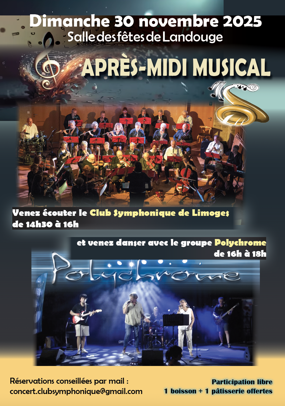 Le Club Symphonique de limoges et le Groupe Polychrome vous invitent à assister à leur après midi musical. De 14h30 à 16h, venez écouter le concert du Club Symphonique de Limoges et de 16h à 18h venez écouter et danser avec le groupe Polychrome (variété pop rock).