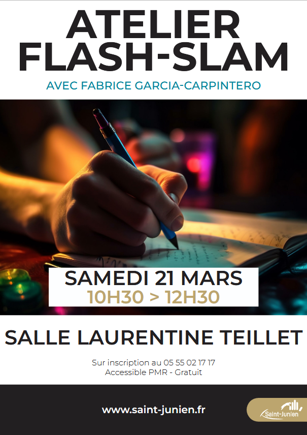 Laissez parler votre créativité et plongez dans l’univers du slam aux côtés de Fabrice Garcia-Carpintero, artiste passionné et inspirant ! Au fil de cet atelier convivial, explorez l’écriture courte, jouez avec les mots et donnez vie à vos textes grâce à la mise en voix et à l’enregistrement. Vos créations pourront même rejoindre les distributeurs à histoires des médiathèques de Saint-Junien, Oradour-sur-Glane et Rochechouart. Une expérience originale pour oser s’exprimer, partager et s’amuser avec la langue.