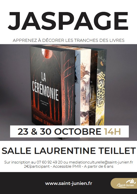 Découvrez l’art du jaspage, cette technique originale qui sublime les tranches des ouvrages avec couleurs, motifs et textures uniques ! Lors de ces deux séances, laissez libre cours à votre imagination pour personnaliser vos livres ou redonner vie à ceux de la Médiathèque. Un atelier à la fois créatif et convivial, parfait pour partager un moment d’inspiration en famille ou entre amis.