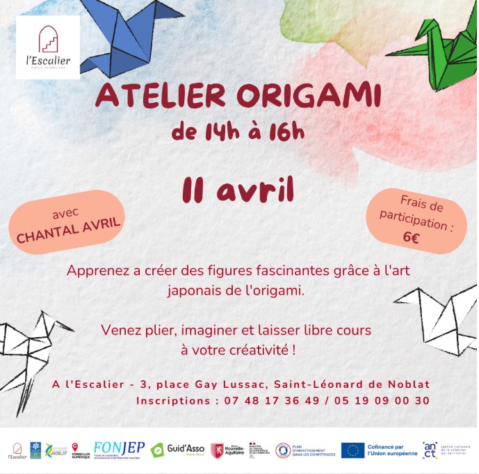 L'escalier, Tiers lieu associatif welcomes Chantal Avril for a relaxing and creative origami workshop. You'll learn basic and advanced origami techniques, develop your creativity and patience, and meet other enthusiasts in a convivial atmosphere.