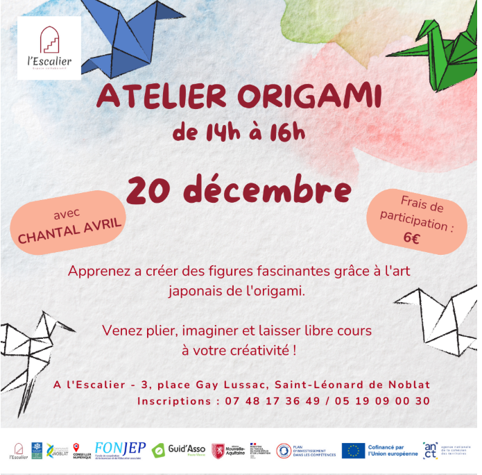 L'escalier, Tiers lieu associatif accueille Chantal Avril pour un atelier origami pour un moment de détente et de créativité. Vous apprendrez les techniques de base et avancées de l'origami, vous développerez votre créativité et votre patience et vous rencontrerez d'autres passionnés dans une ambiance conviviale.