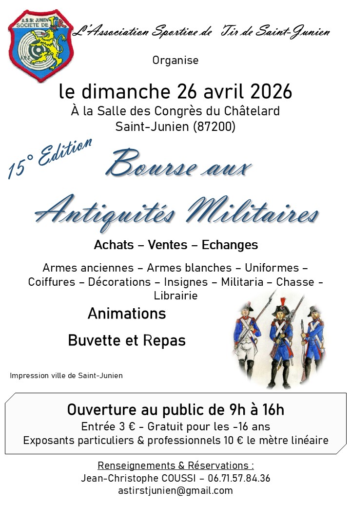 Passionnés d’histoire et de militaires, ne manquez pas la 15ᵉ édition de la Bourse aux Antiquités Militaires organisée par l’Association Sportive de Tir de Saint-Junien !