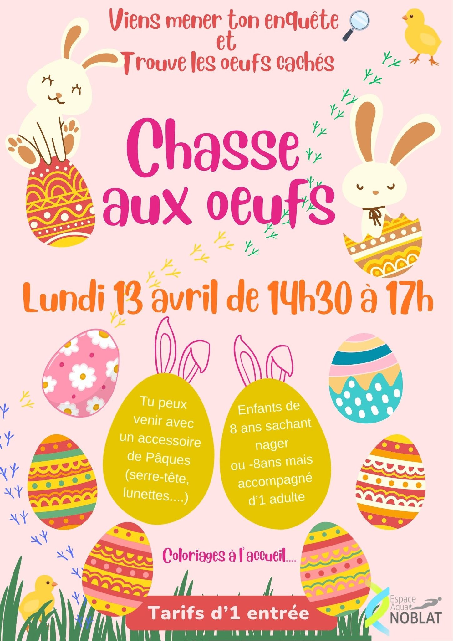 Venez mener ton enquête et trouver les œufs cachés à l'Espace Aqua Noblat. Venez avec un accessoire de Pâques (serre-tête, lunettes) pour les enfants à partir de 8 ans et sachant nager ou - 8 ans avec un adulte accompagnateur