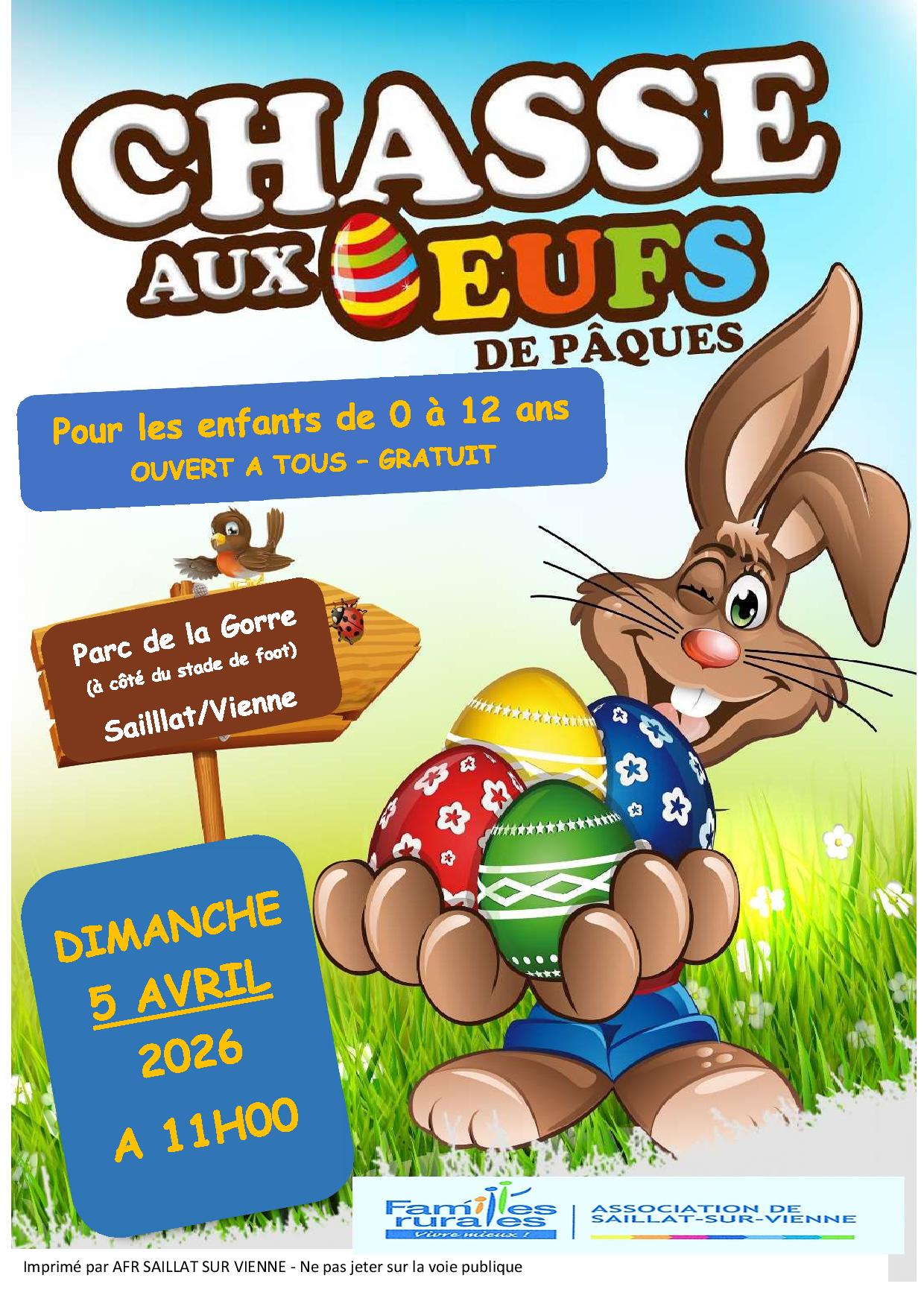 To celebrate Easter, children and their parents are invited to join in the fun and enjoyment of an egg hunt organized by FAMILLES RURALES in Saillat-sur-Vienne!