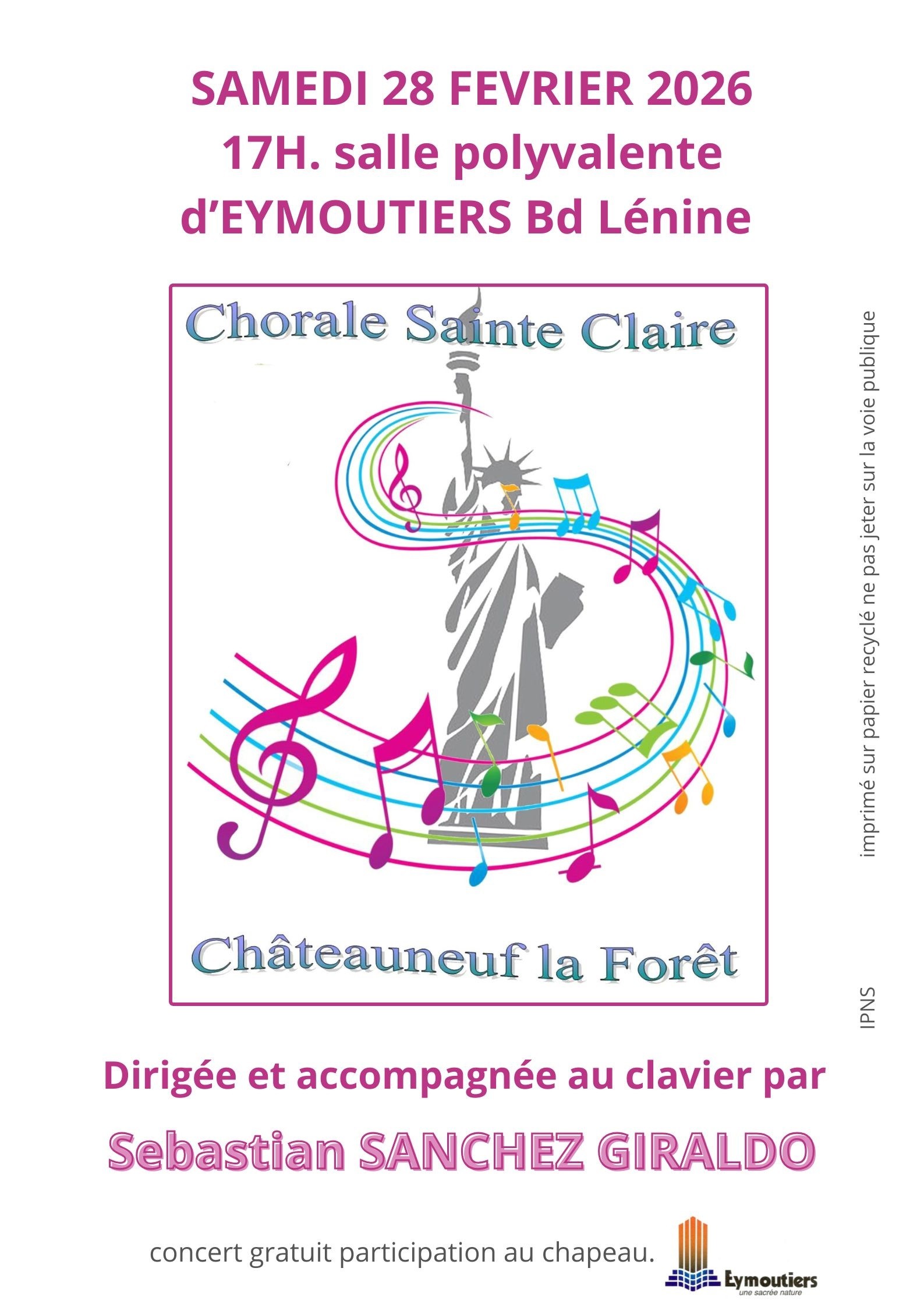 Rendez-vous à la salle polyvalente d’Eymoutiers, pour un moment musical chaleureux et convivial avec la Chorale Sainte Claire de Châteauneuf-la-Forêt. La chorale sera dirigée et accompagnée au clavier par Sebastian Sanchez Giraldo. Participation au chapeau.