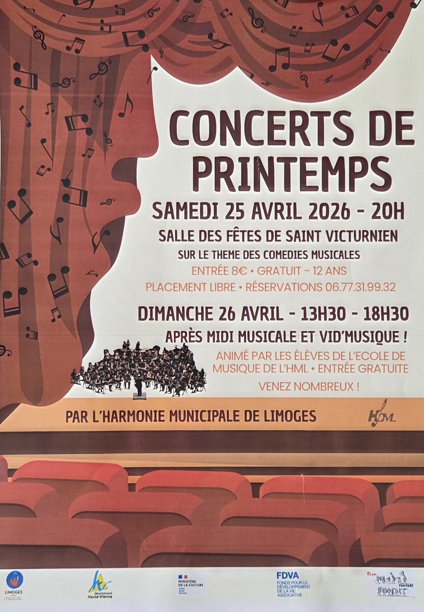 Laissez-vous emporter par la magie des « Concerts de Printemps » à Saint-Victurnien ! Le temps d’un week-end, la musique s’invite en fête et vous promet des instants riches en émotions. Samedi soir, plongez dans l’univers enchanteur des comédies musicales lors d’un concert vibrant et plein d’énergie, interprété par l’Harmonie Municipale de Limoges.