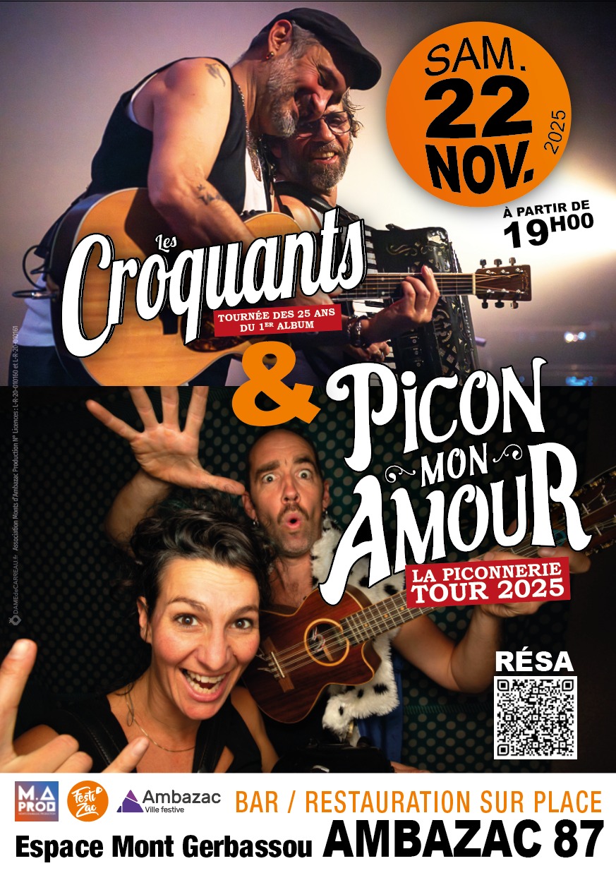 Une soirée de chanson française dépoussiérée et déculottée ! Danito et Kif du groupe 𝐋𝐞𝐬 𝐂𝐫𝐨𝐪𝐮𝐚𝐧𝐭𝐬 dépoussièrent la chanson française de façon festive et populaire tout en lui rendant hommage à travers des dizaines de morceaux plus ou moins oubliés. Ils repartent sur les routes pour 𝐬𝐞𝐮𝐥𝐞𝐦𝐞𝐧𝐭 𝟐𝟓 𝐜𝐨𝐧𝐜𝐞𝐫𝐭𝐬. 𝐏𝐢𝐜𝐨𝐧 𝐦𝐨𝐧 𝐀𝐦𝐨𝐮𝐫 : en duo dans la vie comme à la scène on dit d’elle qu’elle a du chien et lui du « Deschiens ». Avec leurs chansons culottées à deux voix, ce couple déjanté étanche notre soif musicale et fait swinguer nos zygomatiques. Une soirée que vous n’oublierez pas !
