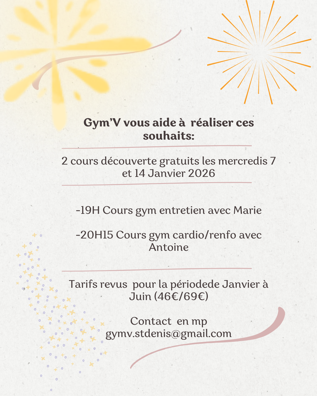 Classes will take place on January 7 and 14, 2026, at the Chatenet multi-purpose hall in Saint Denis des Murs, from 7pm to 8pm for the maintenance GYM class, and from 8:15pm to 9:15pm for the muscle-building and cardio GYM class.