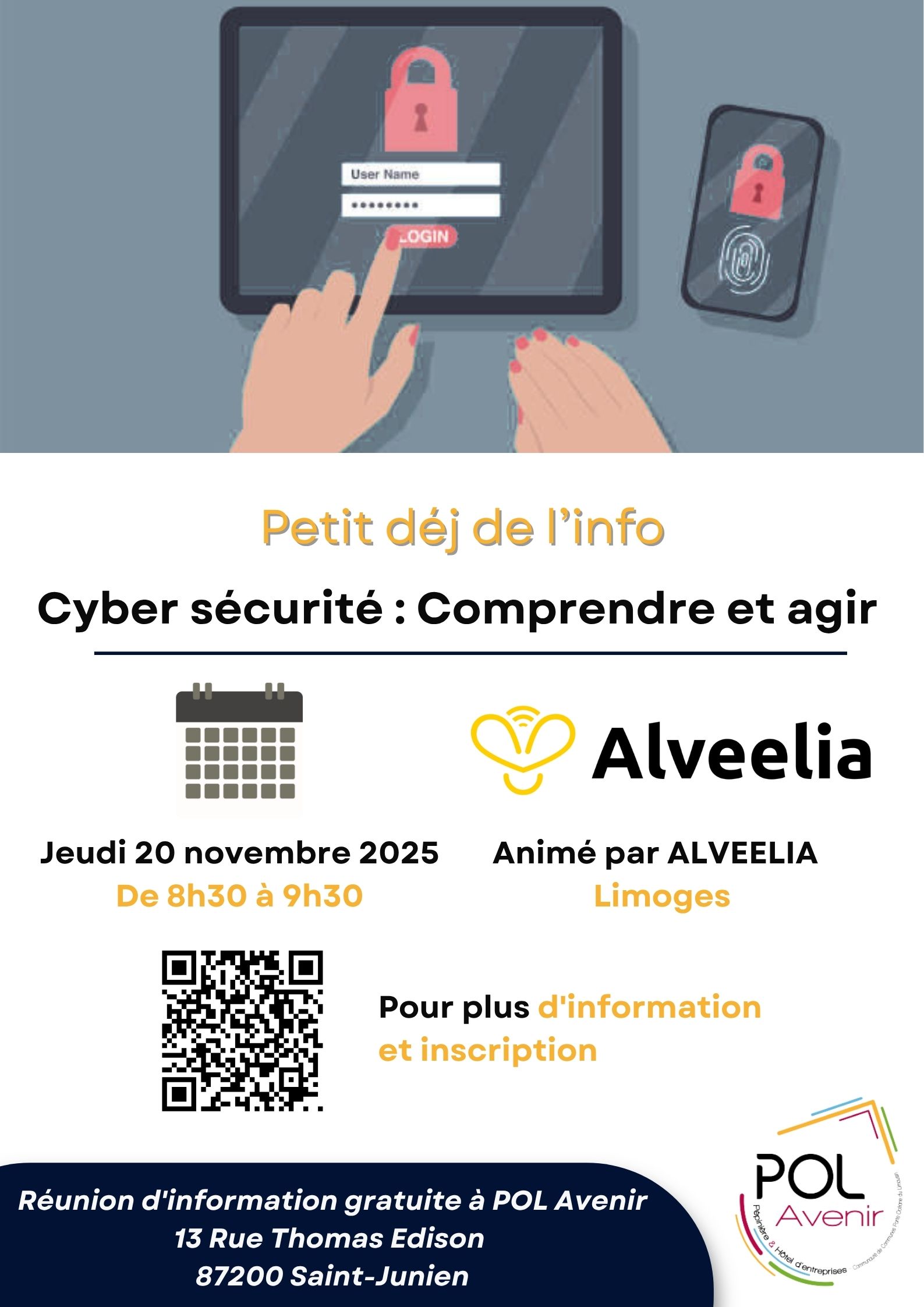Rejoignez-nous à la Pépinière et Hôtel d’entreprises POL Avenir pour un moment convivial animé par ALVEELIA Limoges, en présence de la Gendarmerie et de la Police Nationale. Ensemble, parlons concrètement des menaces numériques qui nous concernent tous — entreprises, collectivités ou particuliers — et découvrez les bons réflexes pour mieux protéger vos données.
