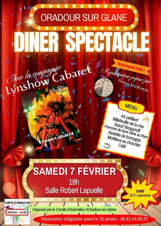 The Comité d'Animation d'Oradour-sur-Glane invites you to an unforgettable evening! To kick off the year in style, they've concocted an exceptional event for you: their traditional Cabaret Dinner and Show! Dive into the dazzling world of cabaret in the company of the fabulous Lynshow cabaret company. Feathers, sequins and captivating performances, get ready for an evening full of emotion and magic! Don't forget to reserve your seats, as they're sure to sell like hotcakes. Don't miss this unique experience! An evening to escape, laugh and share unforgettable moments with family and friends. The entertainment committee looks forward to seeing you at this first event of the year, full of surprises!