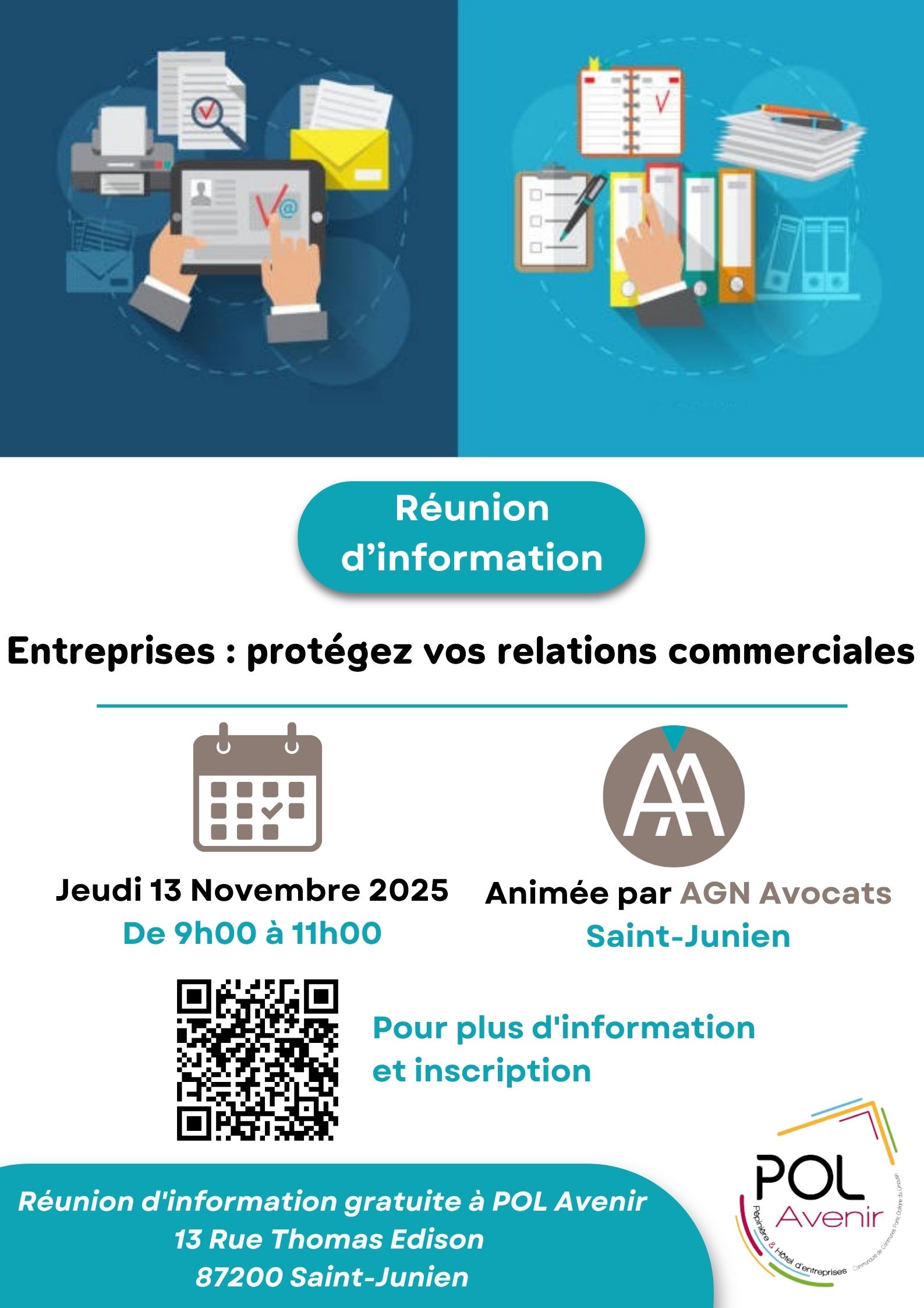 Structurer et sécuriser ses relations commerciales, c’est la clé d’une activité sereine ! La Pépinière d’entreprises Pol Avenir vous invite à un atelier animé par AGN Avocats Saint-Junien pour faire le point sur vos conditions générales de vente (CGV). Pourquoi sont-elles indispensables ? Quelles informations doivent y figurer ? Comment les rendre claires et opposables ? Et surtout, comment réagir face aux impayés sans perdre pied ?