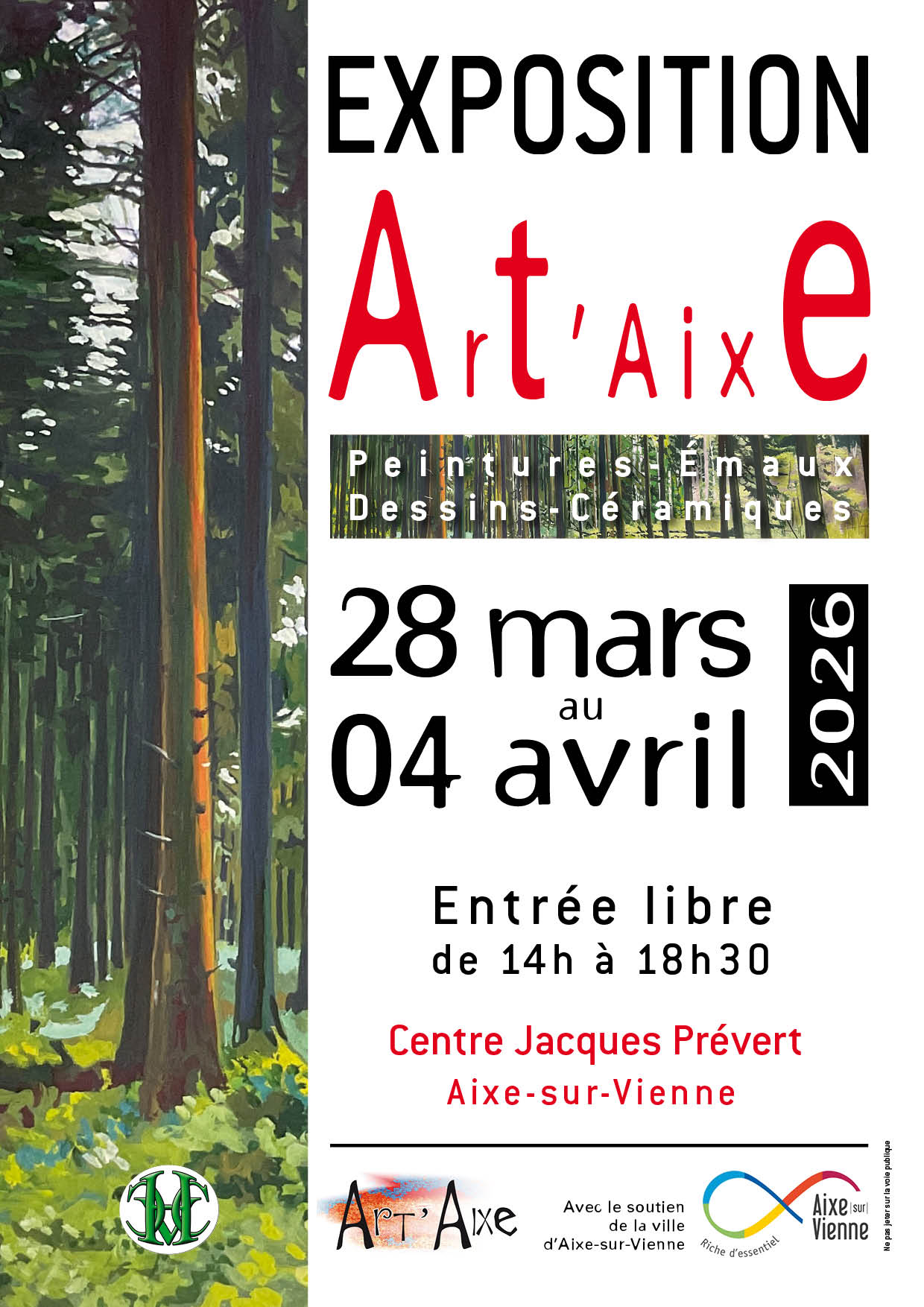Organized with the support of the City of Aixe-sur-Vienne, this artistic encounter offers a moment of discovery and exchange accessible to all. Art lovers and the curious alike will be able to stroll between the creations, appreciate the sensitivity of the artists and let themselves be carried away by a convivial and cultural atmosphere.