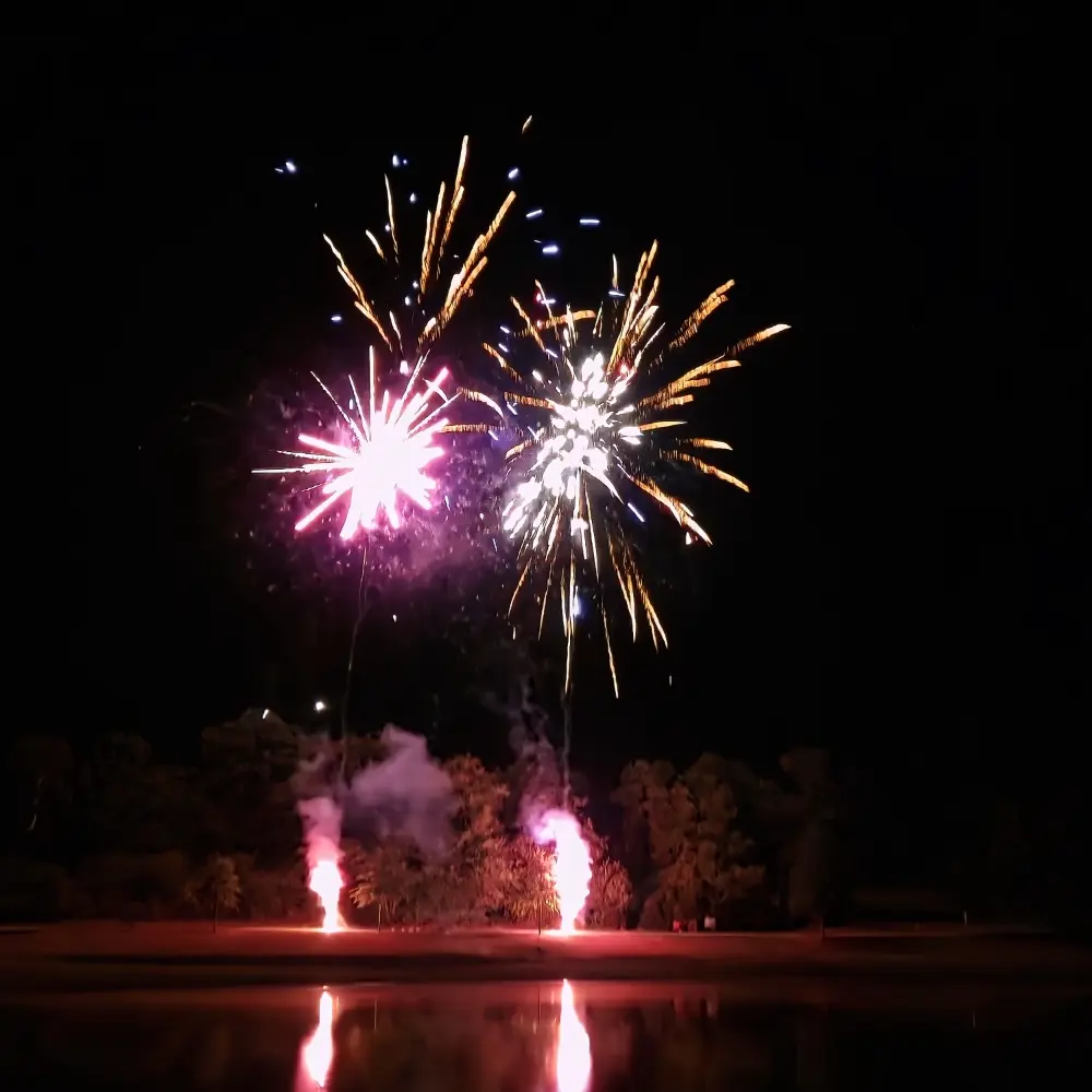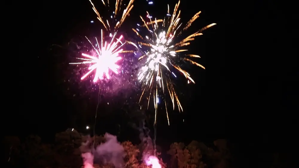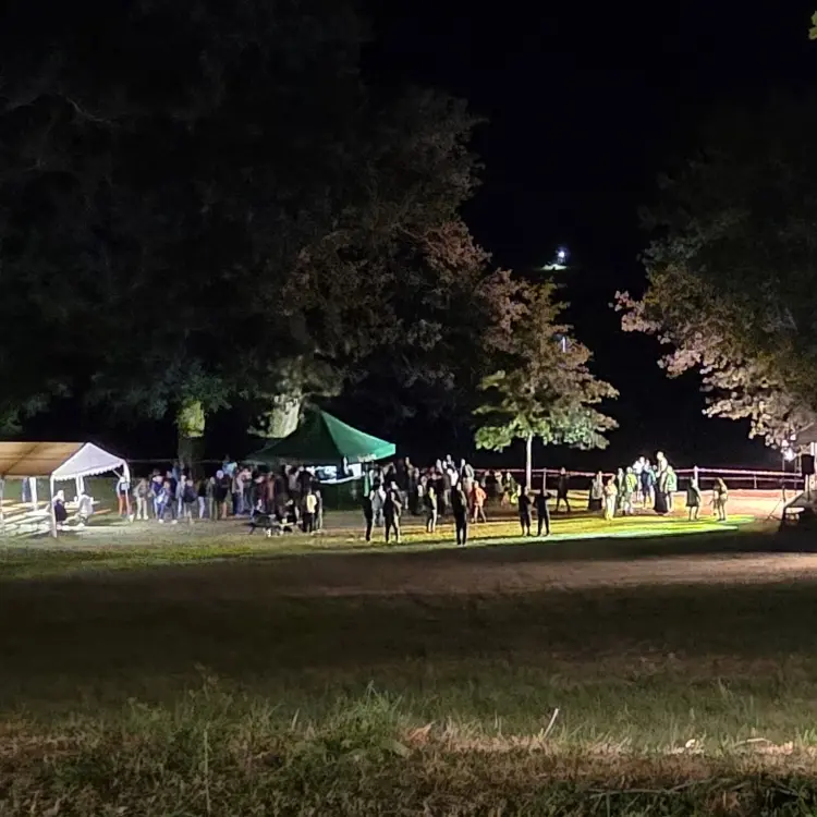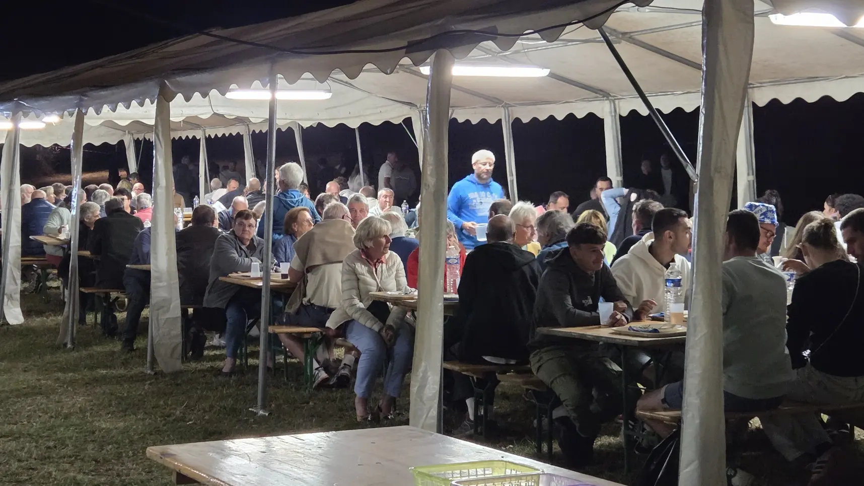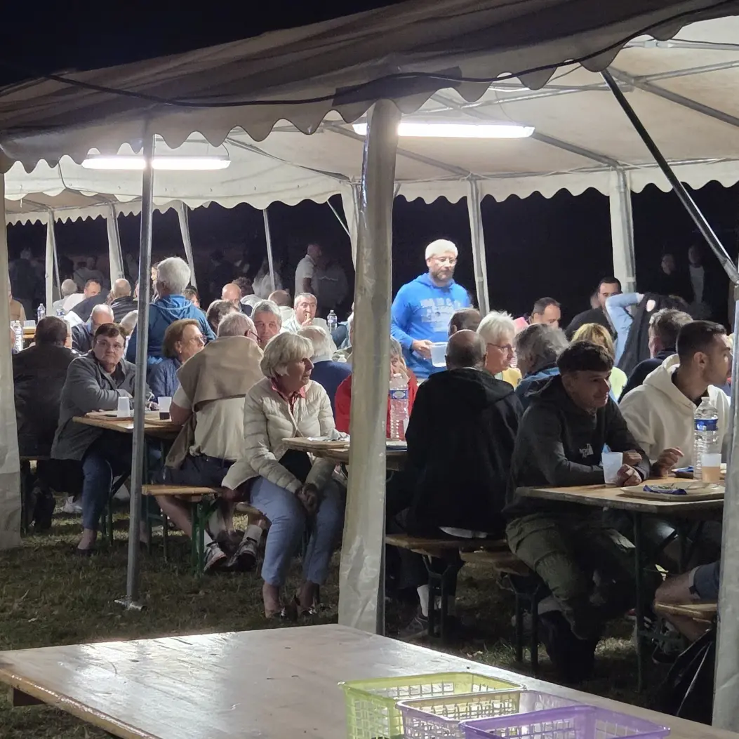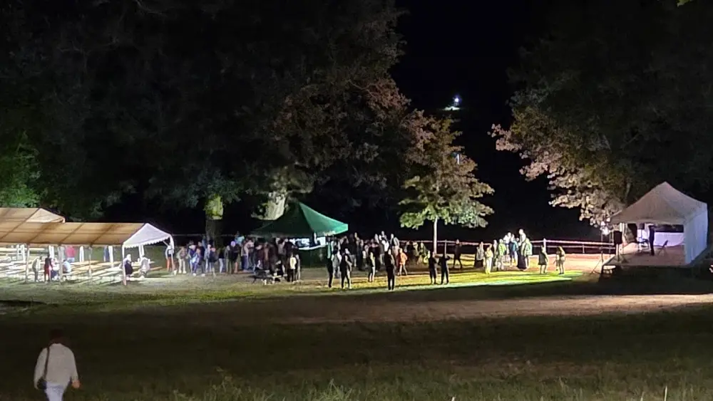 Repas en soirée avec jambon à la broche, animation musicale, feu d'artifice.