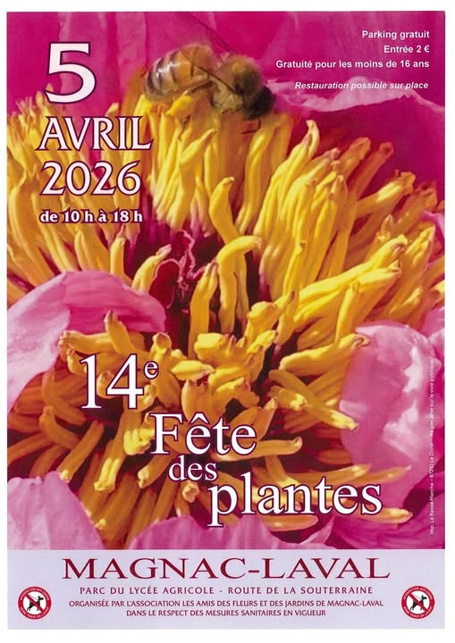 Comme tous les ans, la fête des plantes de Magnac-Laval rassemble de nombreux exposants de qualité produisant : rosiers, arbustes fruitiers et décoratifs, plantes vivaces, vignes, palmiers, plants de fleurs et de légumes, plantes aromatiques, joubarbe, décoration de jardin, poteries, braseros, graines, miel, safran, savons, bijoux et petite librairie.