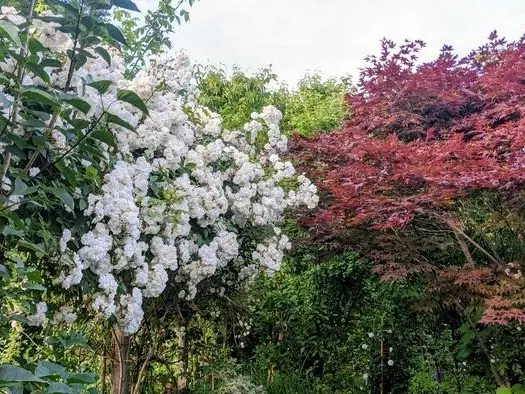 Après plus de vingt ans, ce jardin permet la découverte d'une multitude de rosiers dont des lianes qui atteignent maintenant plus de dix mètres ! Une collection d'acers du japon, de viburnums, de sureaux, d'arbres à écorces remarquables, de fusains, de malus et de crataegus participent au nourrissage des oiseaux.