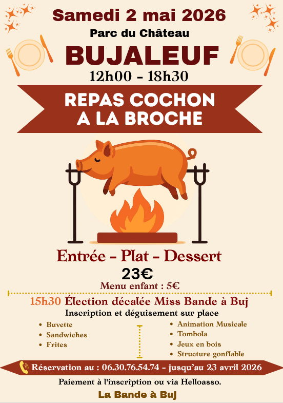 Rendez-vous au parc du Château de Bujaleuf pour une journée placée sous le signe de la convivialité et du partage. Laissez-vous tenter par un délicieux repas cochon à la broche, servi à partir de midi dans une ambiance chaleureuse et familiale. Au programme : un menu complet (entrée, plat, dessert) qui ravira les amateurs de cuisine traditionnelle, ainsi que de nombreuses animations pour petits et grands tout au long de l’après-midi. À 15h30, ne manquez pas l’originale élection décalée Miss Bande à Buj : bonne humeur et créativité garanties ! Sur place également : buvette, restauration rapide, jeux en bois, structure gonflable, tombola et animation musicale pour prolonger le plaisir.