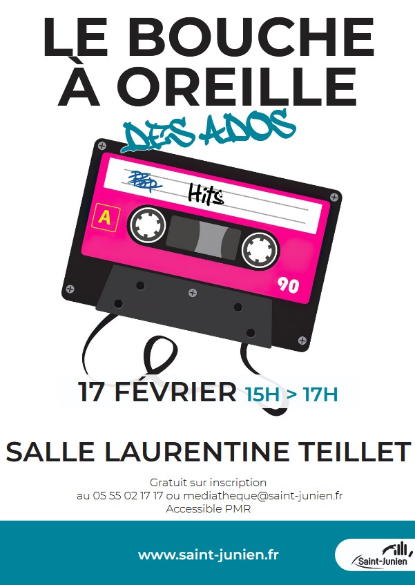 Envie de papoter entre passionnés ? Le Bouche-à-oreille des ados t’invite à un moment fun et détendu à la médiathèque de Saint-Junien ! Viens partager tes coups de cœur — livres, films, séries, jeux vidéo, musiques… — et découvrir ceux des autres. C’est l’occasion parfaite pour échanger, rire et faire le plein d’idées sans se prendre la tête. Que tu sois grand lecteur, gamer ou cinéphile, tu trouveras forcément ta tribu !