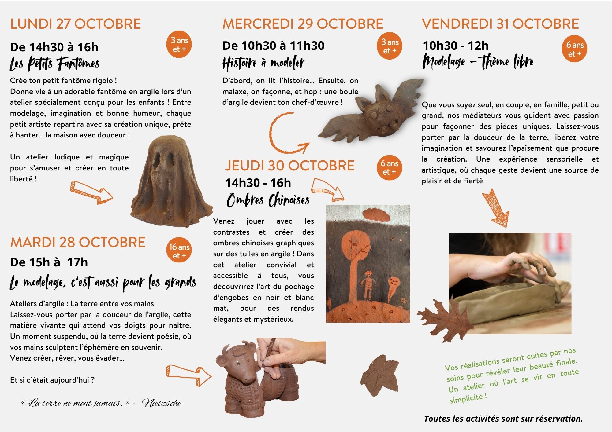 Ateliers d'argile : La terre entre vos mains, laisser-vous porter par la douceur de l'argile, cette matière vivante qui attend vos doigts pour naître. Un moment suspendu, où la terre devient poésie, où vos mains sculptent l'éphémère en souvenir. Venez créer, rêver, vous évadez... (16 ans et +). Activité sur réservation.