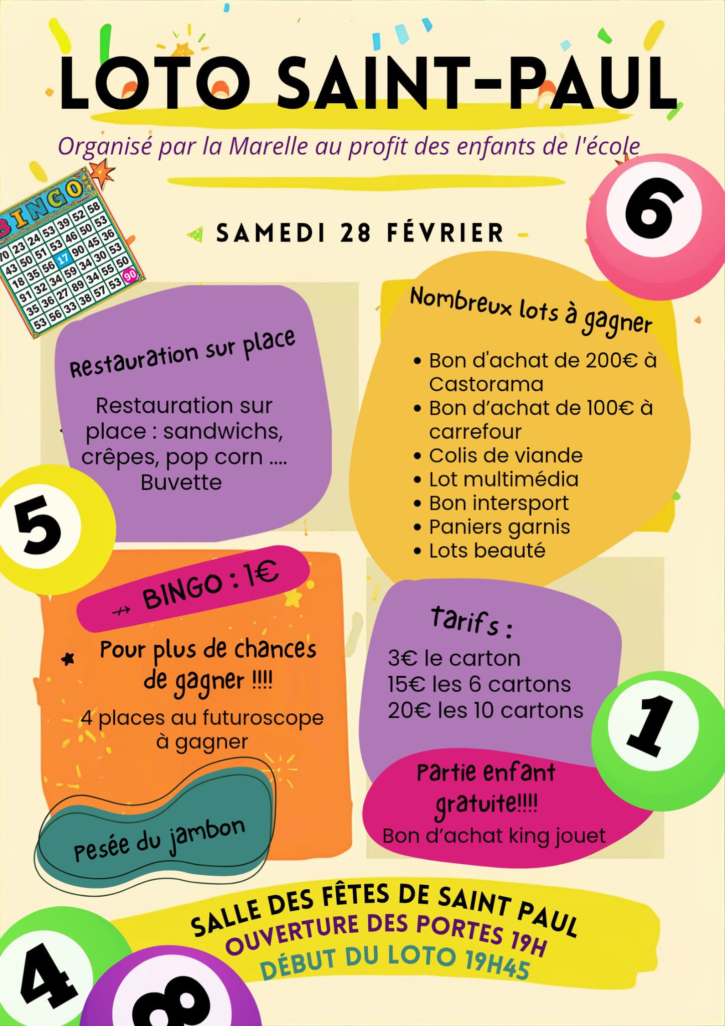 La Marelle, the parents' association of Saint-Paul school, is organizing a bingo to benefit the school's children, with lots of prizes to be won.