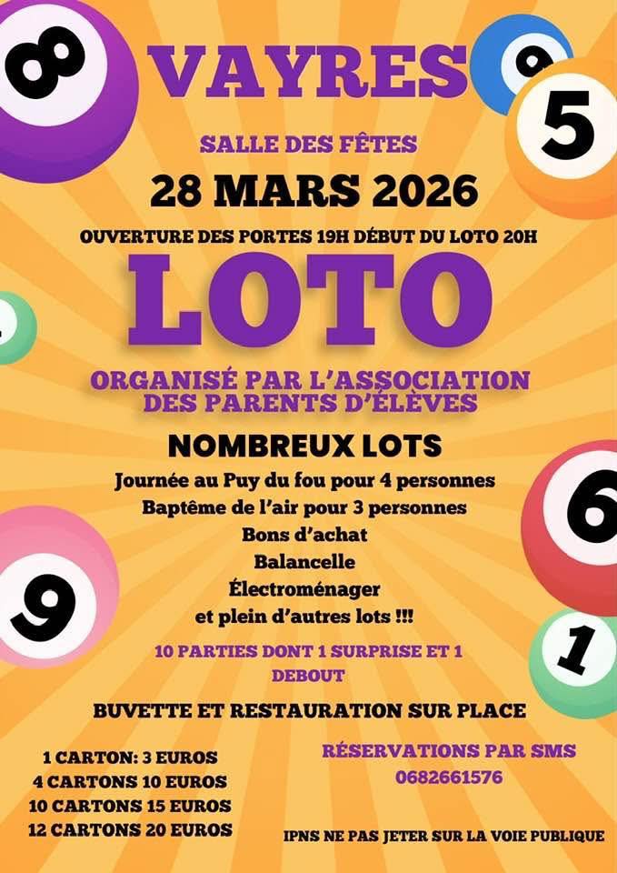 Ce loto promet une belle ambiance à Vayres, organisé par l’association des parents d’élèves. Installez-vous confortablement et laissez-vous porter par l’excitation du jeu, avec de nombreux lots à remporter : journée au Puy du Fou, baptême de l’air, bons d’achat, électroménager et bien d’autres surprises.