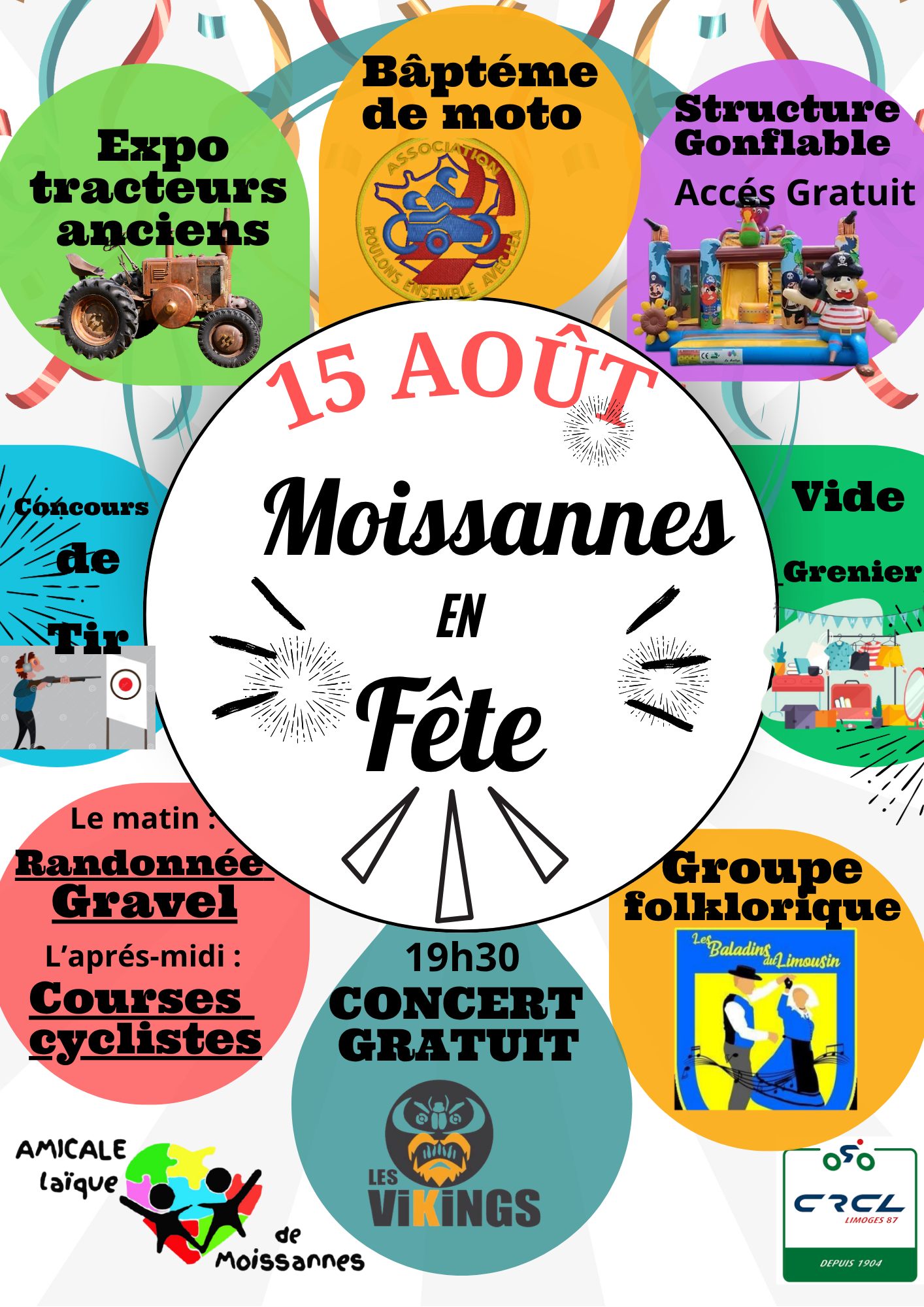 Fête du village avec de nombreuses animations: vide greniers, exposition de tracteurs anciens, concours de tirs à la carabine ouvert à tous, baptême de moto avec l'association "Roulons ensemble avec Léa", Structure gonflable en accès gratuit, Groupe folklorique "Les Baladins du Limousin", Randonnée Gravel ouverte à tous, courses cyclistes en partenariat avec le club CRCL87, concert gratuit avec le groupe "Les Vikings".