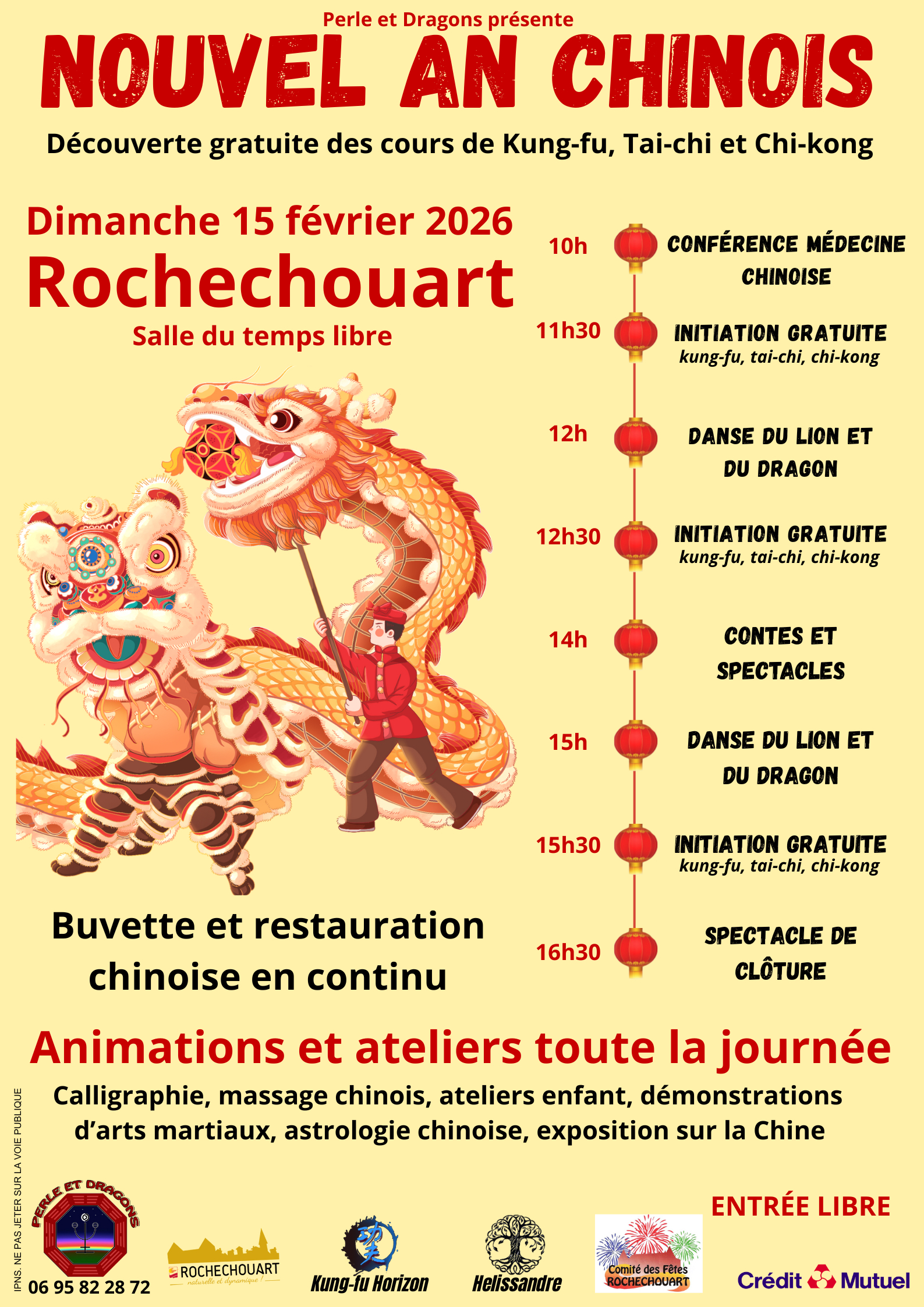 Plongez au cœur des traditions asiatiques à l’occasion du Nouvel An Chinois célébré à Rochechouart ! La Salle du Temps Libre s’anime toute la journée avec une programmation festive et dépaysante. Danses du lion et du dragon, contes et spectacles rythmeront l’événement, aux côtés d’initiations gratuites au kung-fu, tai-chi et chi-kong, accessibles à tous. Une conférence sur la médecine chinoise viendra compléter cette immersion culturelle. Petits et grands pourront aussi profiter d’animations variées : calligraphie, ateliers enfants, démonstrations d’arts martiaux, astrologie chinoise ou encore exposition dédiée à la Chine. Sans oublier la buvette et la restauration chinoise en continu pour prolonger le voyage des sens. Entrée libre.