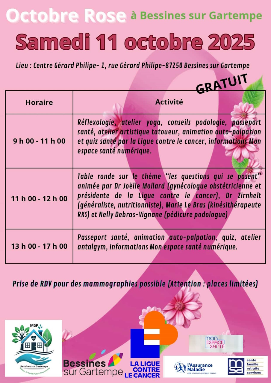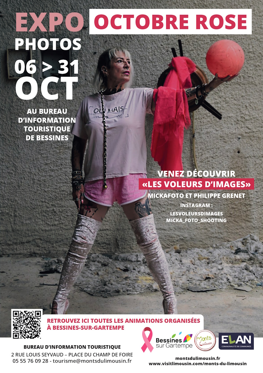 As part of the national "Octobre Rose" event, Bessines town council is getting involved! 05: Run with the athletics club. On the 11th, from 10 a.m. to 5 p.m. at the Gérard Philipe cultural center: conference with Dr Molat, president of the French League for the Prevention of Breast Cancer; a dozen workshops (physiotherapist, midwife, yoga, tattoo artist, Pass Sport Santé, wigmaker, dietician, etc.). On the 19th, from 12 noon to 5 p.m. on the Place du Champ de Foire: a gathering and a short ride in vintage cars with the Rétromobiles association. 25th: dinner dance with Omnisport and Dans'é vous. Other events: hiking, darts competition. Throughout October, in partnership with Mickafoto Shooting and the Monts du Limousin Tourist Office: exhibition at 6 avenue du 11 Novembre and at the Bessines Tourist Information Office. Program to be confirmed.