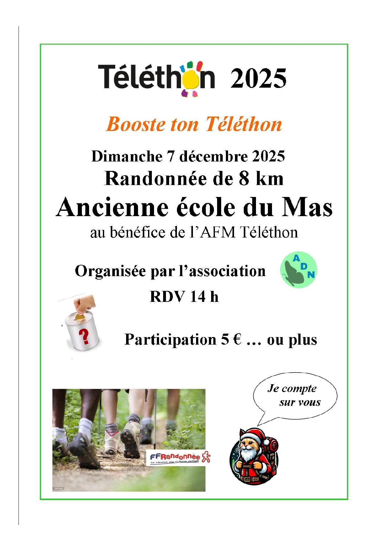Departing from the old Mas school, an 8 km trail awaits you to get some fresh air, enjoy nature and support the AFM Téléthon. The organizing association, ADN, will welcome you from 2pm in a friendly atmosphere. Whether you come alone, with friends or family, this is the perfect opportunity to get moving for a good cause.