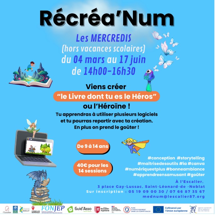 You'll create your own book and be the hero. You'll learn how to use different software programs and leave with your creation on June 17 (last date of Récréanum)