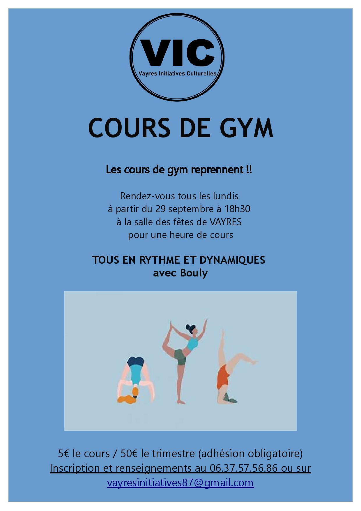 Envie de bouger, de vous défouler et de garder la forme dans une ambiance sympa ? Les cours de gym reprennent à Vayres avec l’association VIC ! Rendez-vous chaque lundi à 18h30, à la salle des fêtes, pour une heure dynamique et pleine d’énergie avec Bouly. Au programme : exercices rythmés, mouvements variés et une bonne dose de bonne humeur pour entretenir votre corps et votre moral. Que vous soyez débutant ou confirmé, chacun avance à son rythme, dans une atmosphère conviviale et motivante. L’occasion parfaite de se retrouver, de partager un moment sportif et de repartir boosté pour la semaine. Payant. Infos et inscriptions soit par sms soit par mail.