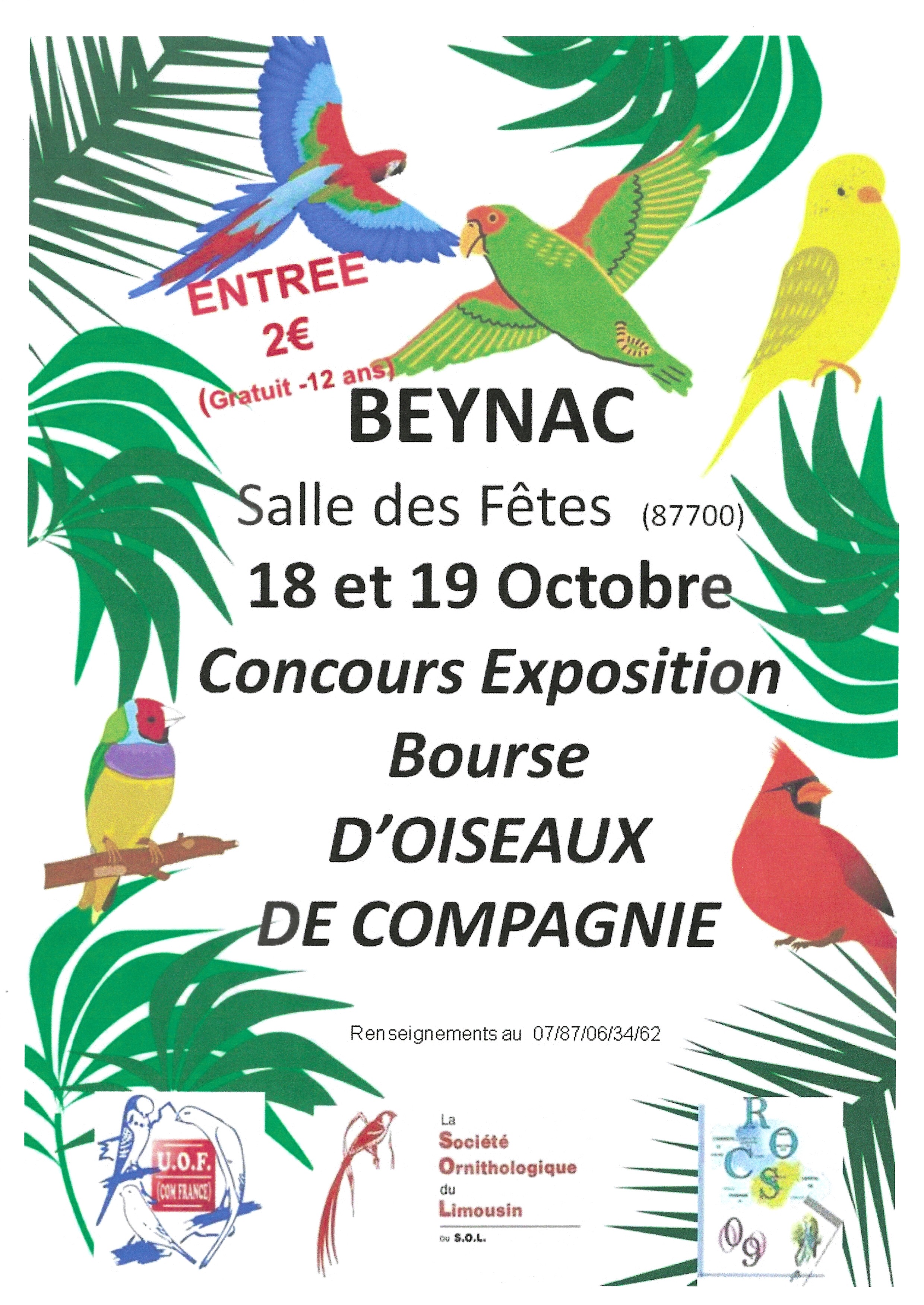La société ornithologique du Limousin vous invite à son 54ème Salon de l'oiseau dans la salle des fêtes de la commune.