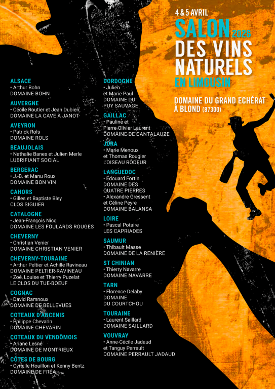 The Salon des Vins Naturels en Limousin is back again, and for this 11th edition, we've prepared a weekend that promises some great discoveries and real encounters. Over the two days, 25 winemakers from all over France will be on hand to help you discover and taste their natural wines, in the friendly, authentic setting of the Grand Echérat in Blond. To accompany the tastings, local producers will also be on hand: oysters, cheeses, charcuterie? A perfect combination of fine wines and tasty dishes.