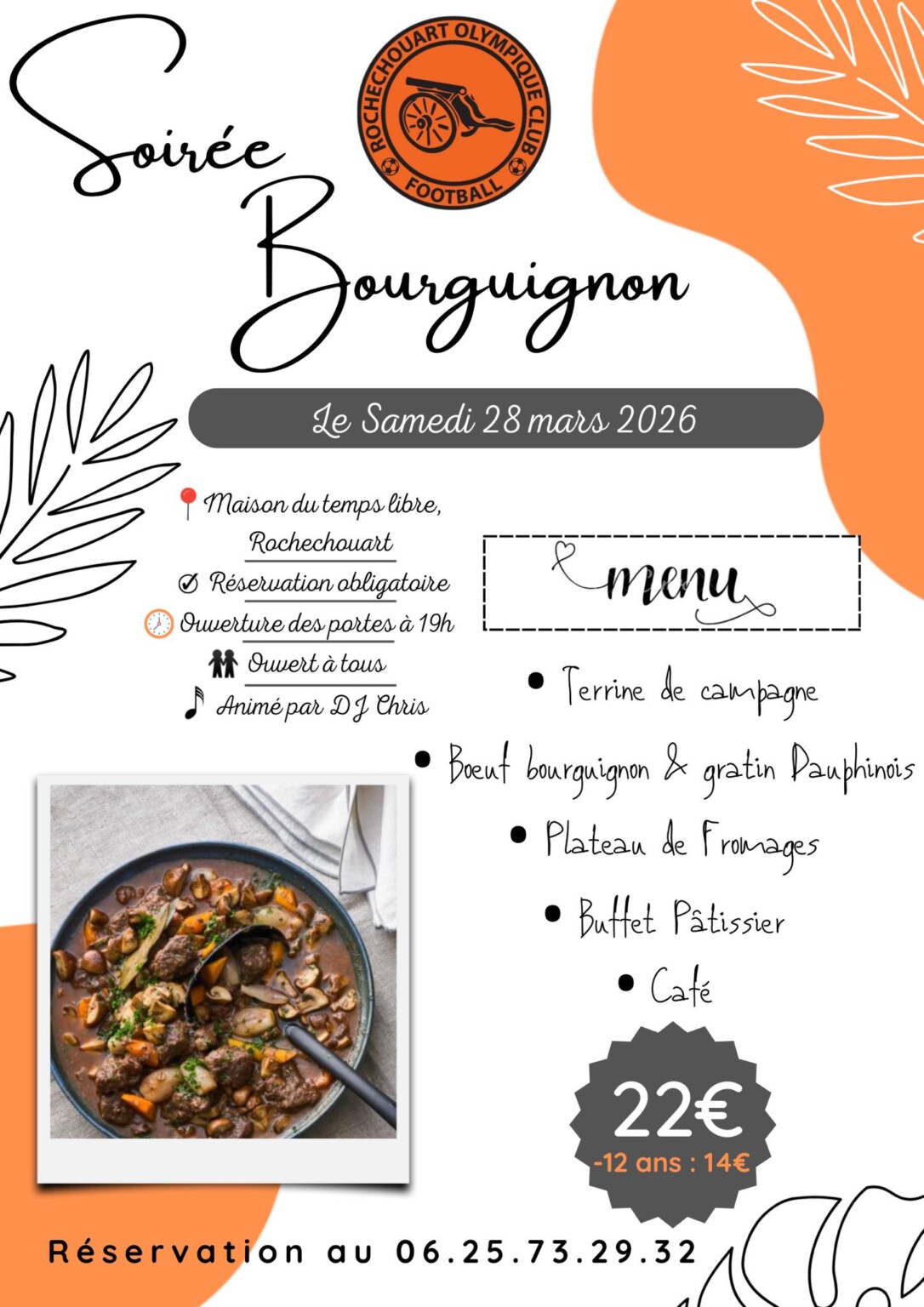 Join the Rochechouart ROC FOOT association for a convivial evening of Burgundian gastronomy! In a warm and musical atmosphere with DJ Chris. On the menu: enjoy a country terrine, a melting beef bourguignon with gratin Dauphinois, a platter of mature cheeses, a gourmet pastry buffet, and finish off with a cup of coffee.