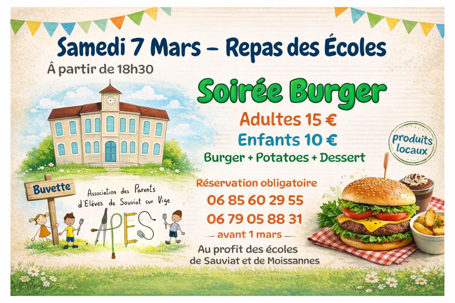 Soirée Burger organisé par l'association des parents d'élèves de Sauviat sur Vige au profit des écoles de Sauviat et Moissannes.