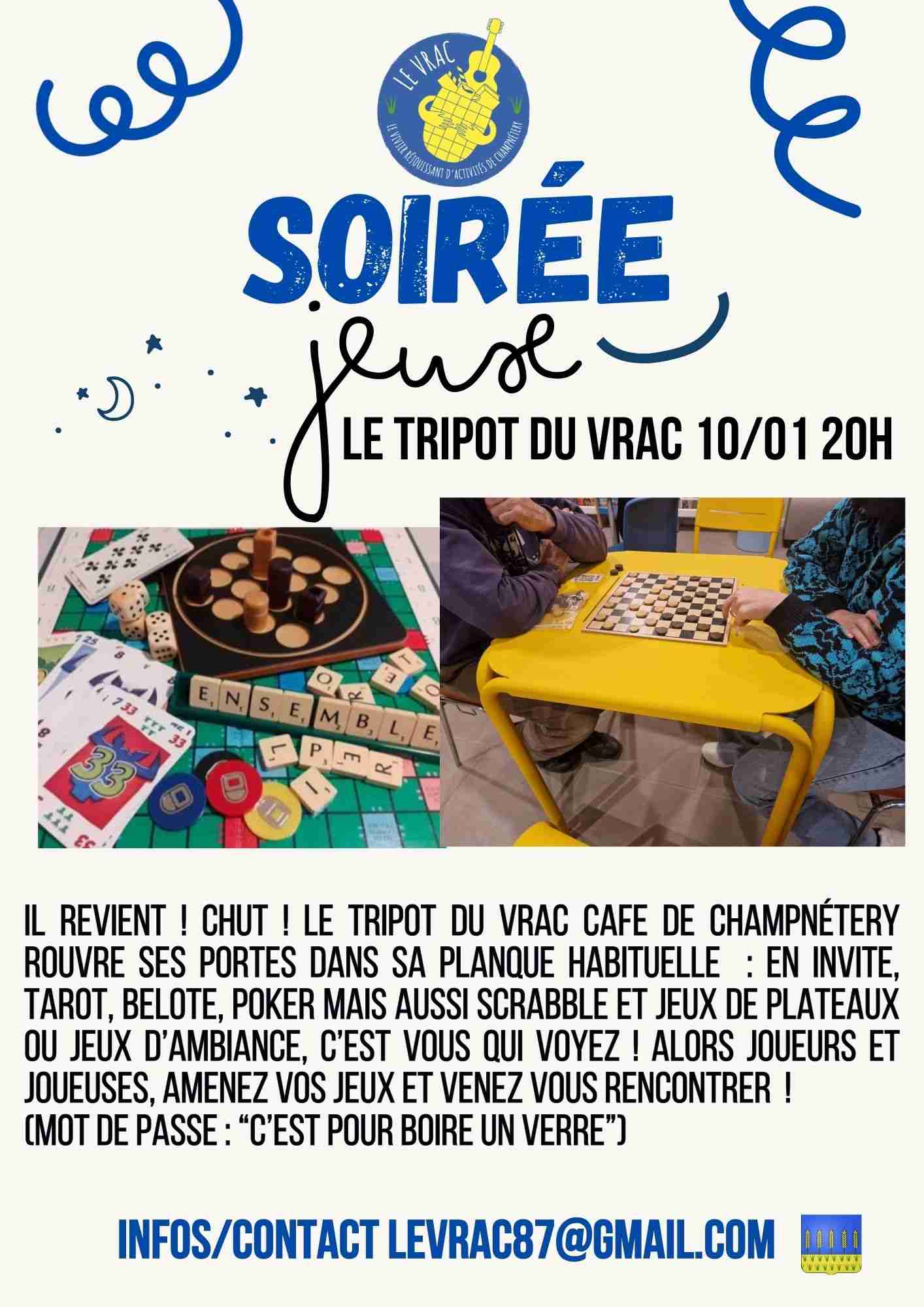 Le tripot du vrac café de Champnetery ouvre ses portes une fois par mois pour une soirée torride. En invité, tarot, belote, poker mais aussi scrabble et jeux de plateaux ou jeux d'ambiance, c'est vous qui voyez. Alors, joueurs et joueuses, sortez vos atouts, ne restez pas sur le carreau, et venez vous rencontrer et amenez vos jeux.
