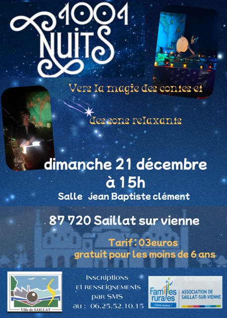 Immerse yourself in the enchanting world of the 1001 Nights with a show where marvellous tales and relaxing sounds combine to offer a gentle journey for young and old alike. Organized by the Familles Rurales association in Saillat-sur-Vienne, this magical interlude invites everyone to escape for an evening of warmth and reassurance.