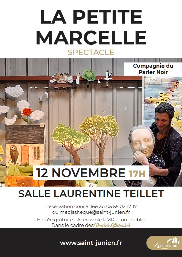 À la médiathèque de Saint-Junien, laissez-vous emporter par un conte animé plein de poésie et d’authenticité ! La conteuse Isabelle Loubère prête sa voix aux histoires inspirées de Marcelle Delpastre, qu’elle a eu la chance de connaître. Autour d’elle, les marionnettes et décors de Quitterie Duvignac, artiste plasticienne, donnent vie à un univers tendre et nostalgique, façonné « à l’ancienne » avec des objets chinés et un vrai savoir-faire artisanal. Entre souvenirs et légendes, la magie opère : Marcelle enfant et Marcelle âgée se rencontrent, croisent le loup, les vaches, la chouette… et tout un bestiaire cher au Limousin. Un moment hors du temps, où les mots, les gestes et les émotions tissent un lien vivant entre mémoire et imaginaire.