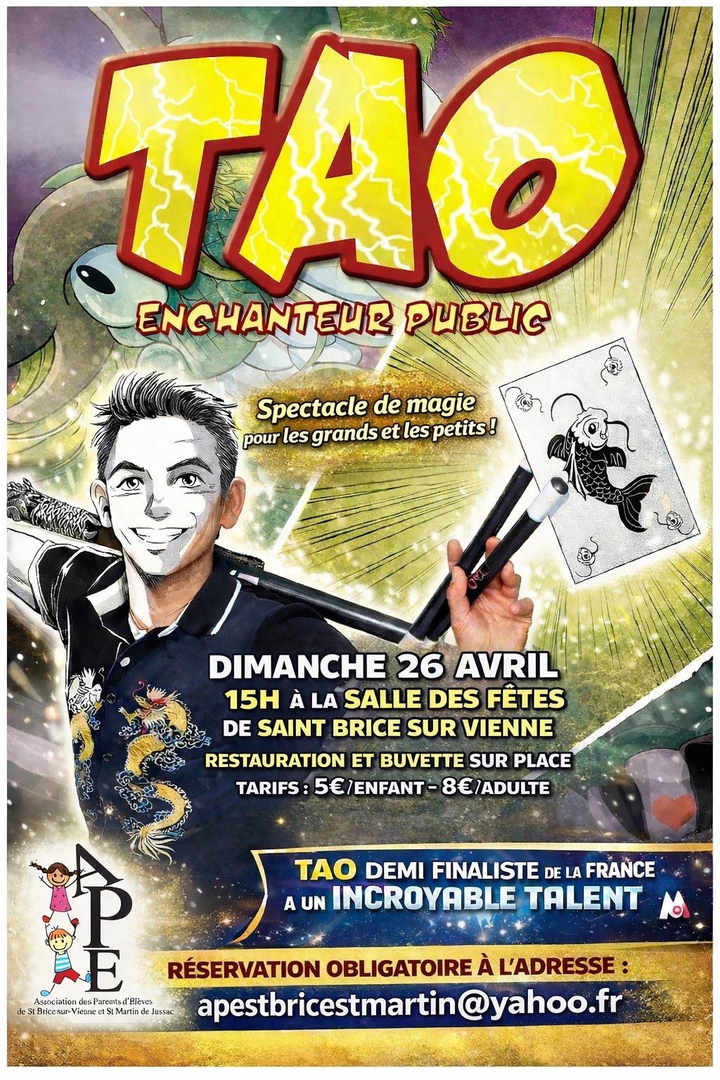 Laissez-vous surprendre par un après-midi placé sous le signe de la magie et de l’émerveillement ! Tao, enchanteur public et demi-finaliste de l’émission « La France a un incroyable talent », vous donne rendez-vous pour un spectacle captivant à partager en famille. Petits et grands seront transportés dans un univers fascinant mêlant illusions, humour et surprises, pour un moment convivial et plein d’émotions.