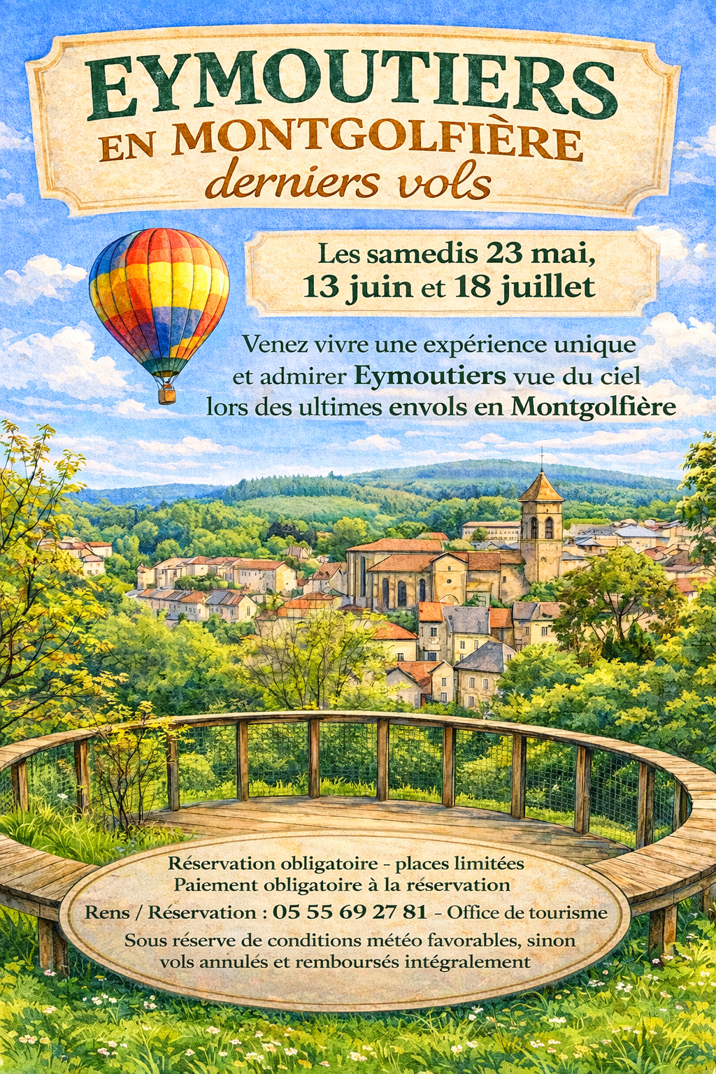 Take to the skies above Eymoutiers for an unforgettable experience. On Saturdays May 23, June 13 and July 18, take to the skies in a hot-air balloon and let the wind carry you along as you discover the local landscapes from a unique angle. From the sky, admire the unspoilt countryside, the rolling hills and the charm of the Pelaude town in a peaceful, magical atmosphere. Reservations required (places are limited). Information and reservations at the Tourist Office. Flights are subject to weather conditions. In the event of bad weather on the day, flights will be cancelled and fully refunded.