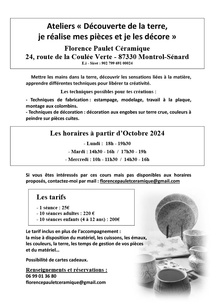 *Earthenware discovery tour: "From earthenware to a piece of decorated earthenware" for groups of 4 to 8 people. 5? per person. Allow at least 30 minutes. No handling is possible. By appointment: 06 99 01 36 80.