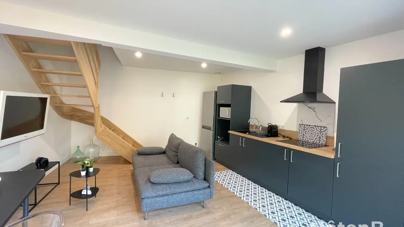 This 50m2 apartment, combining chic and modern design, features a bright living room on the ground floor, with a large bay window facing the fitted and equipped kitchen.