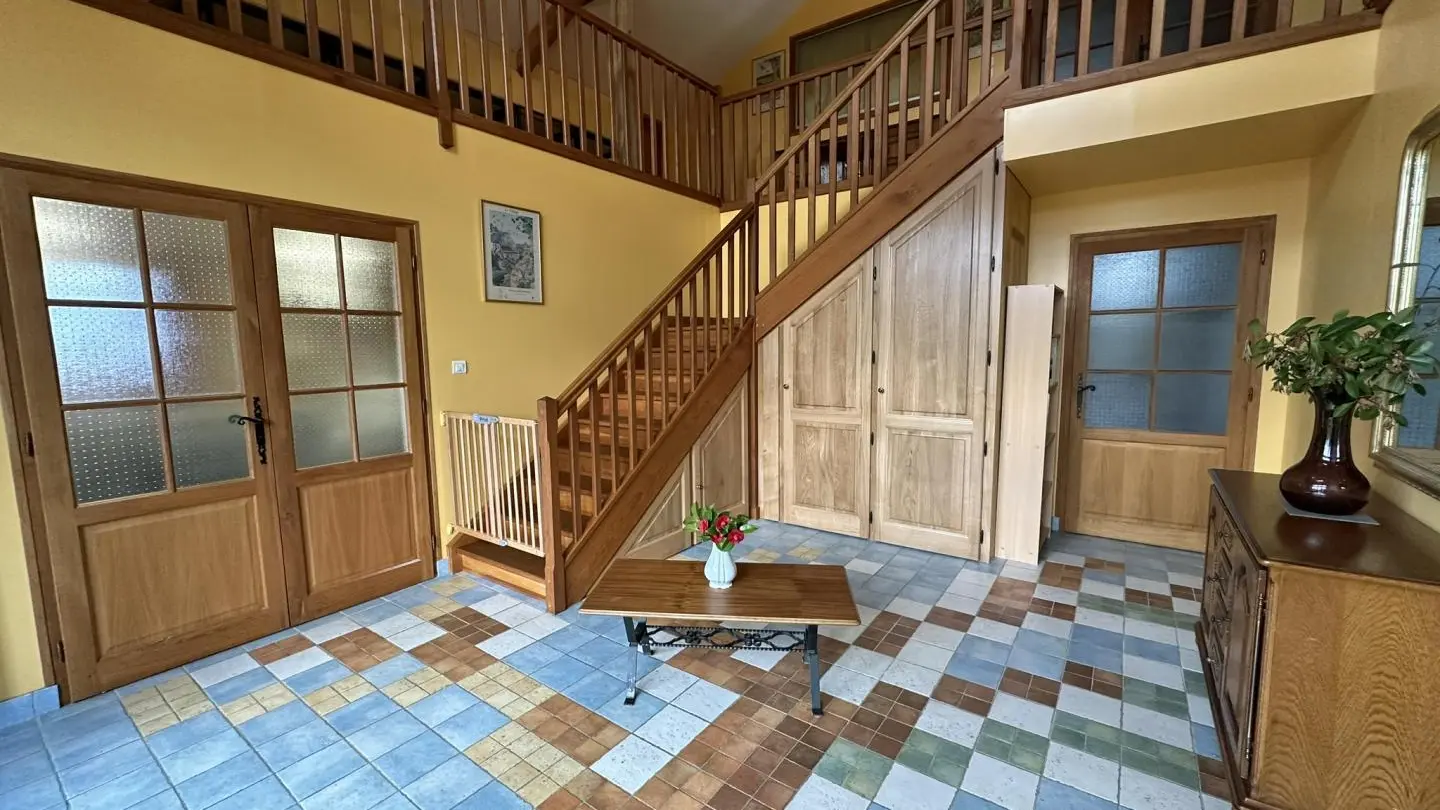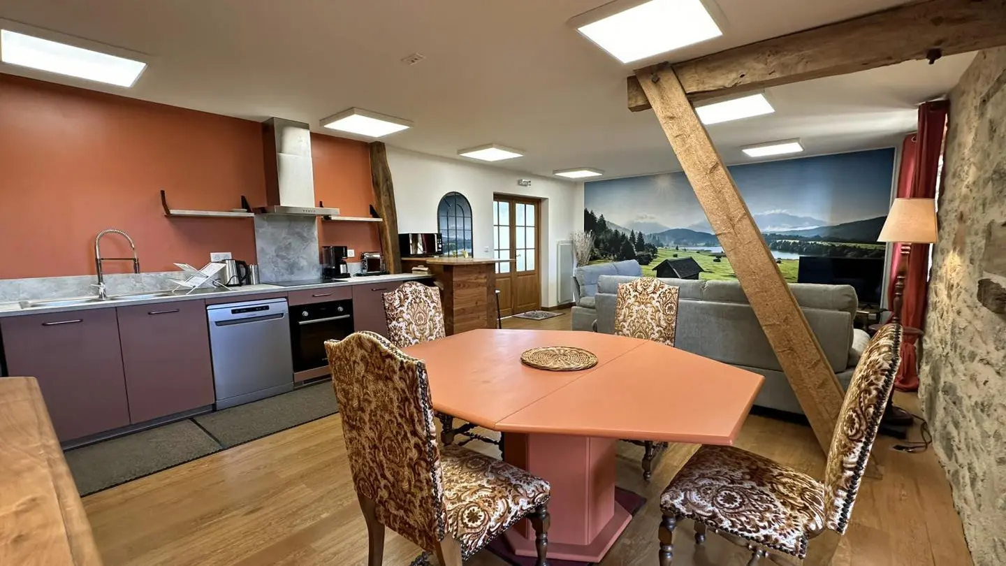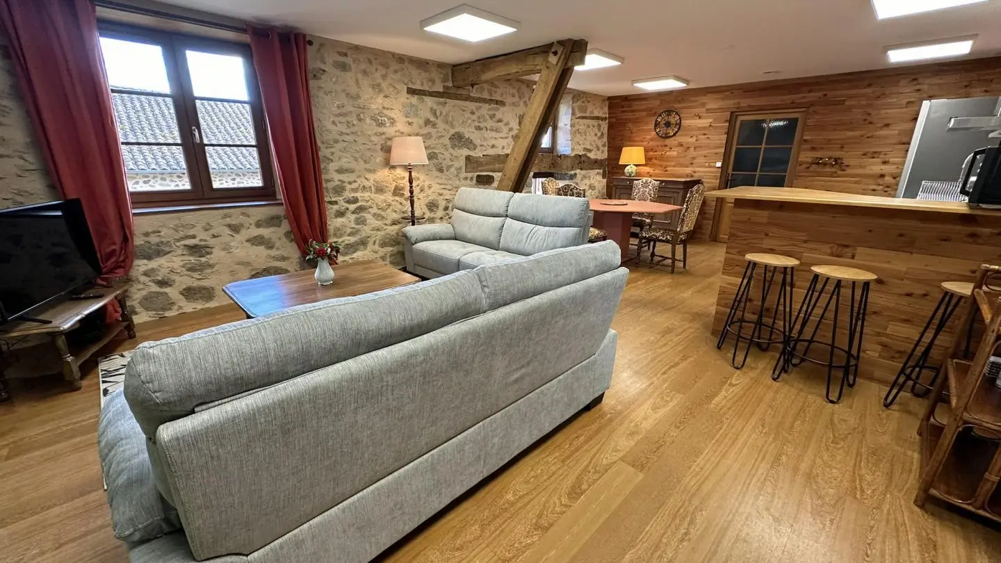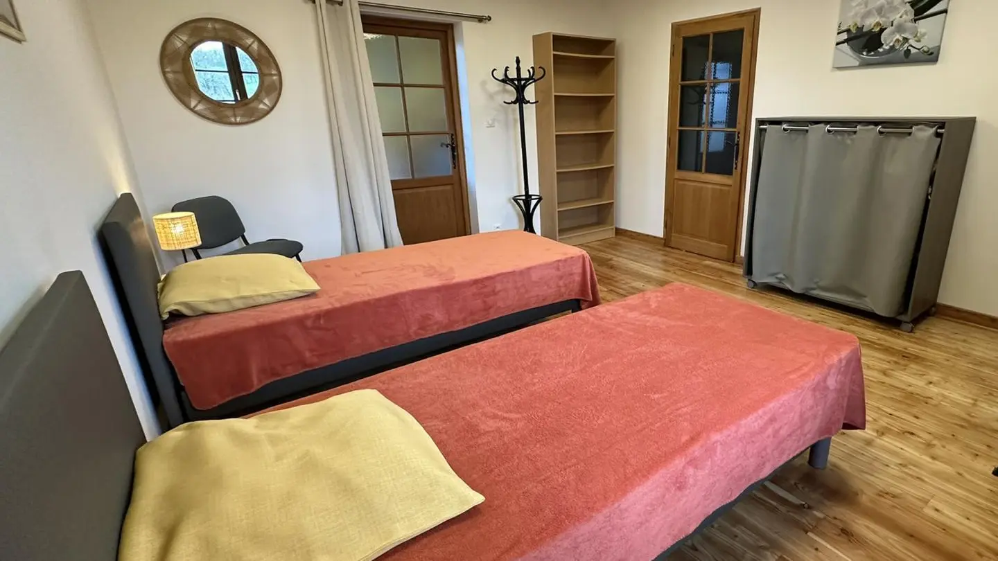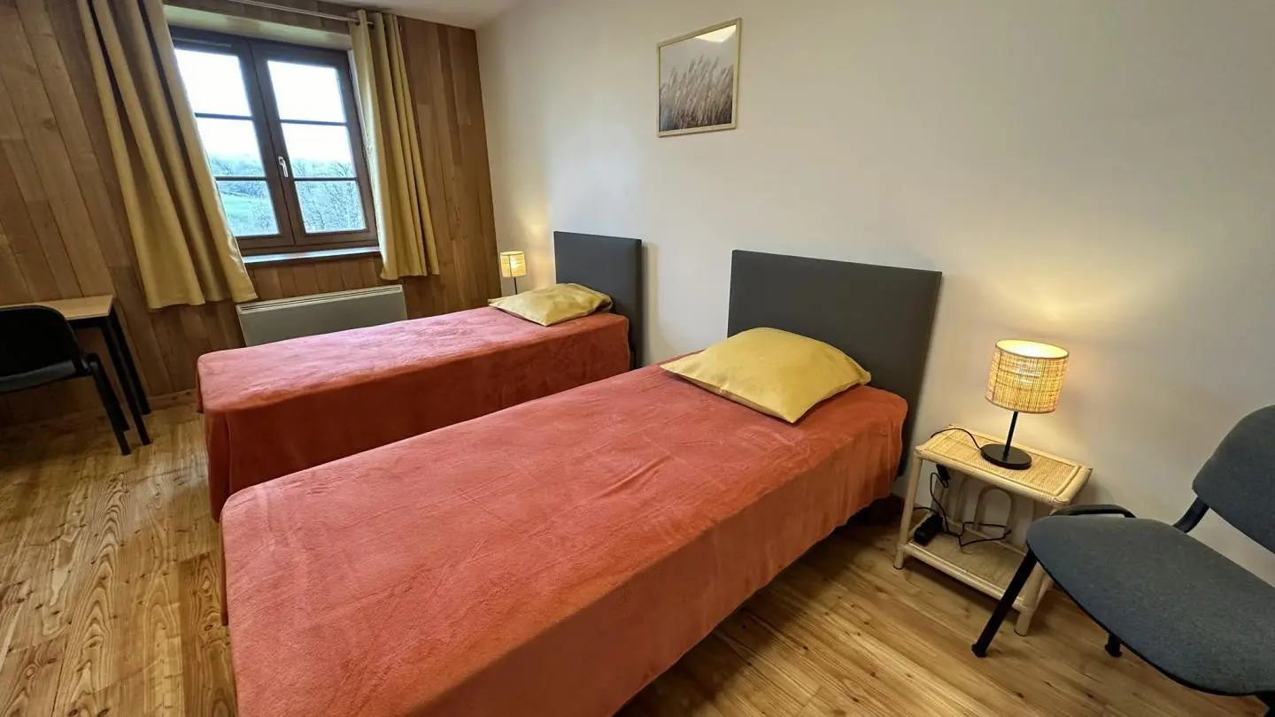 15 minutes south of Limoges, close to the village of Solignac, famous for its abbey and the Briance river, Leygat overlooks the valley. An old barn has been renovated into a house and two independent gîtes. They are surrounded by 8 hectares of private landscaped parkland, with 4 km of footpaths extending off-road to Solignac (1 km). A heated swimming pool (12 x 6 m), open from June to September depending on weather conditions, is shared between each home. Large 74 m² games room with fireplace. Shelter for bikes and motorcycles, parking. Adult and children's bikes available. Swing, boules pitch, table tennis, table soccer.