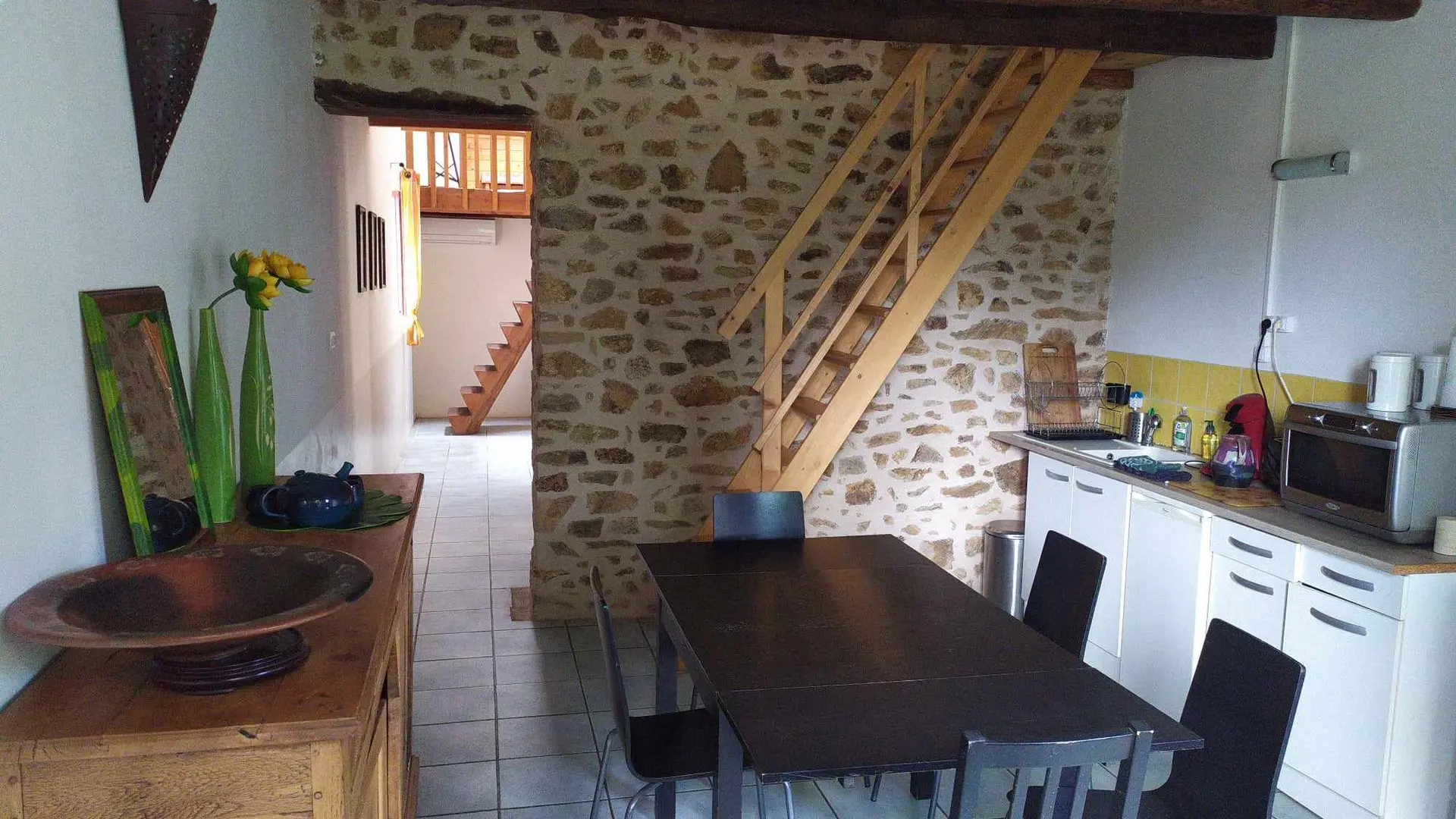 Comprising 2 rooms (living room, kitchen and bathroom) and a sleeping area with 2 mezzanines (1 double bed and 2 single beds) + 1 sofa bed. A veranda with garden furniture completes the furnished accommodation, as does a large plot of land with animals (pigs, donkeys, llamas, etc.).
